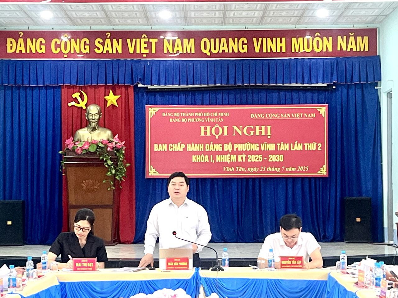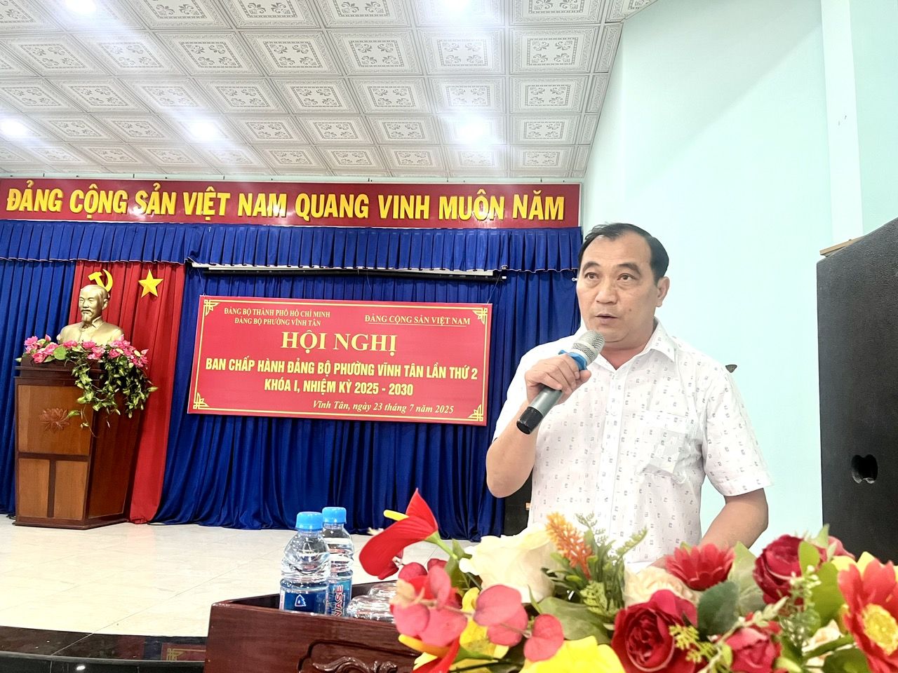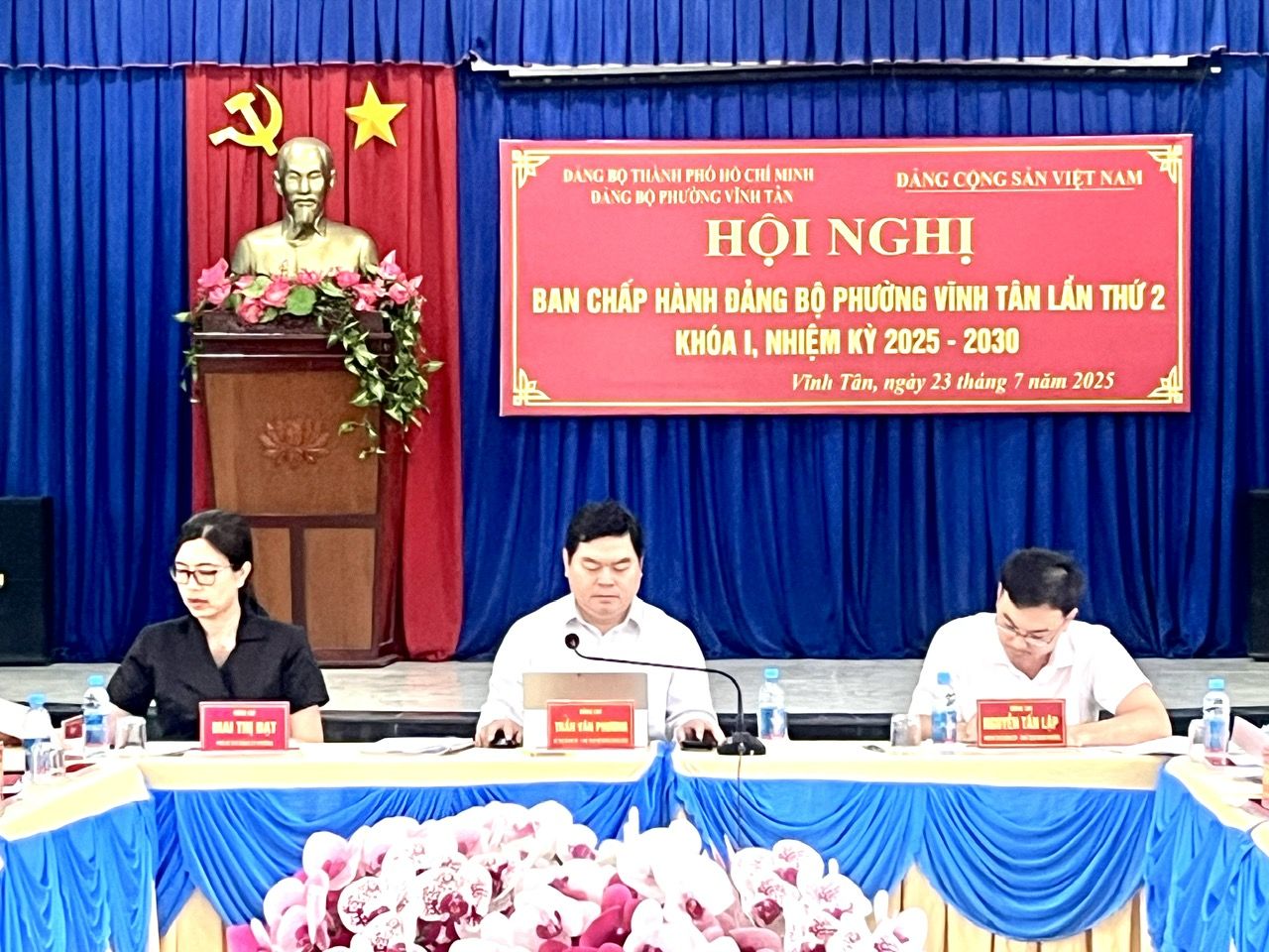 Ngày 23/7/2025, Ban Chấp hành Đảng bộ phường Vĩnh Tân tổ chức Hội nghị lần thứ 2 khoá I, nhiệm kỳ 2025 - 2030. Đồng chí Trần Văn Phương - Bí thư Đảng uỷ, Chủ tịch Hội đồng nhân dân phường Vĩnh Tân chủ trì hội nghị. Cùng dự có đồng chí Mai Thị Đạt - Phó Bí thư Thường trực Đảng uỷ, đồng chí Nguyễn Tấn Lập - Phó Bí thư Đảng uỷ, Chủ tịch Uỷ ban nhân dân phường cùng các đồng chí Uỷ viên Ban Thường vụ, Uỷ viên Ban Chấp hành Đảng bộ phường.