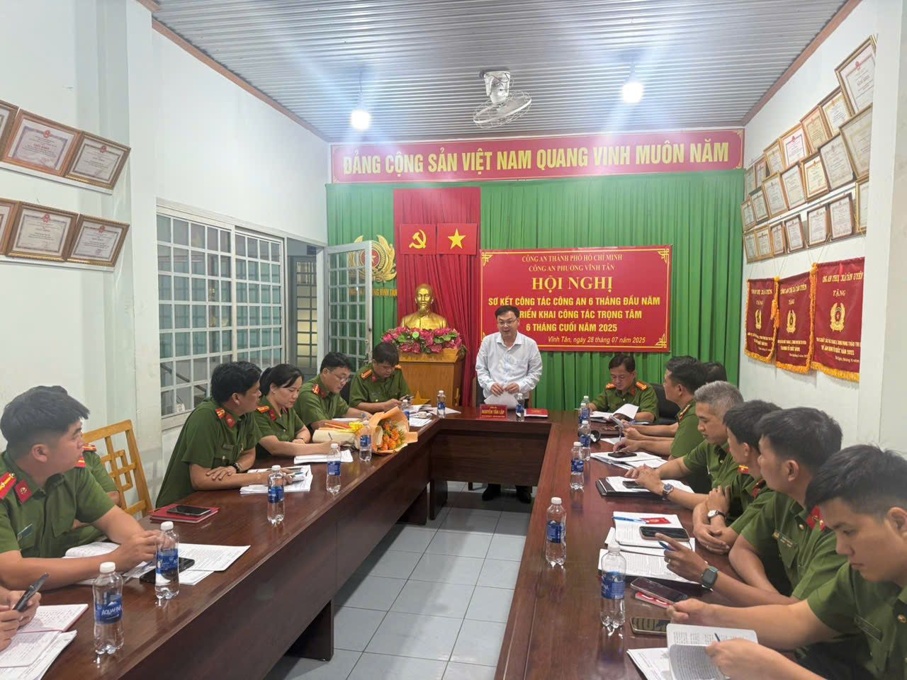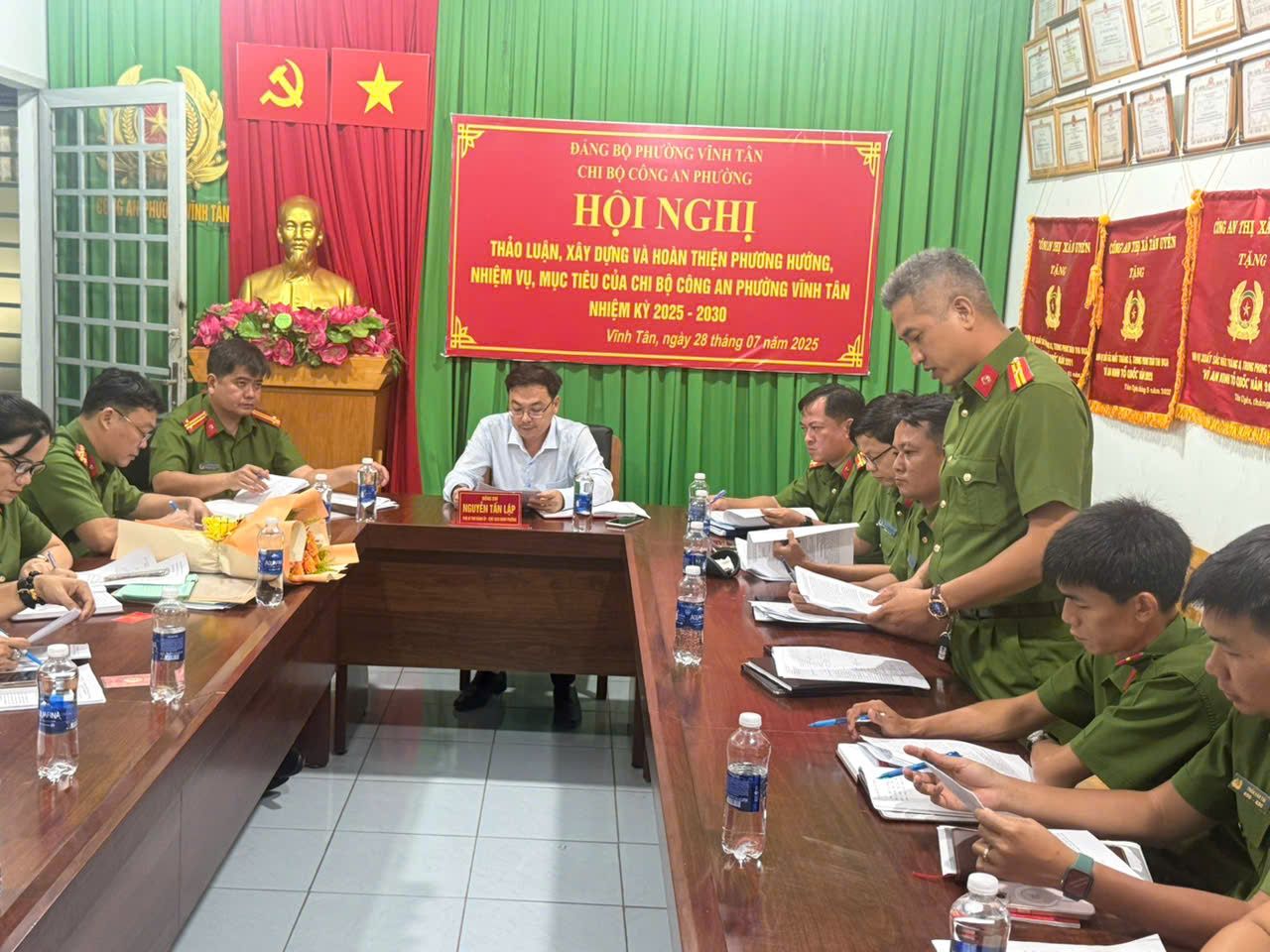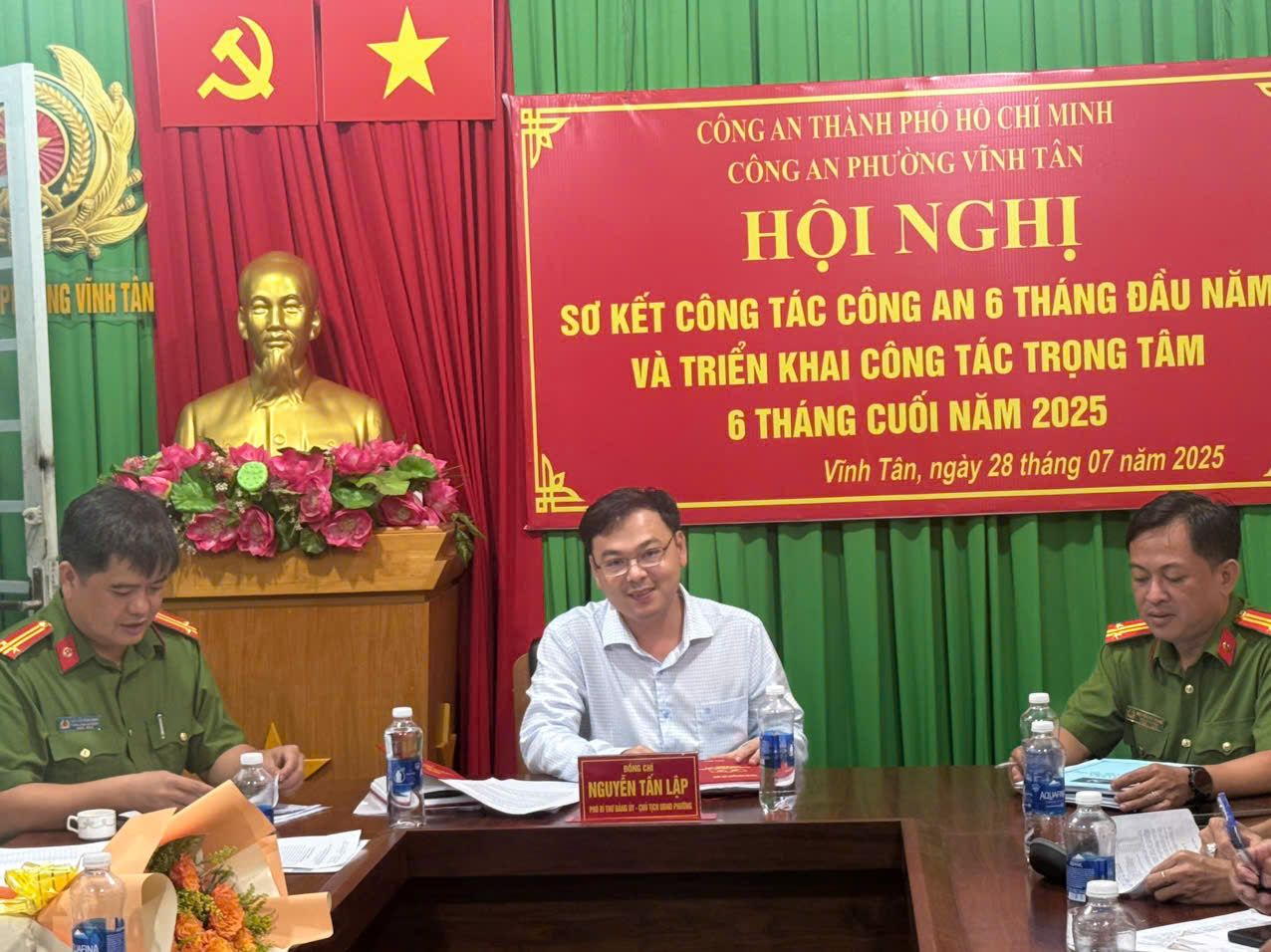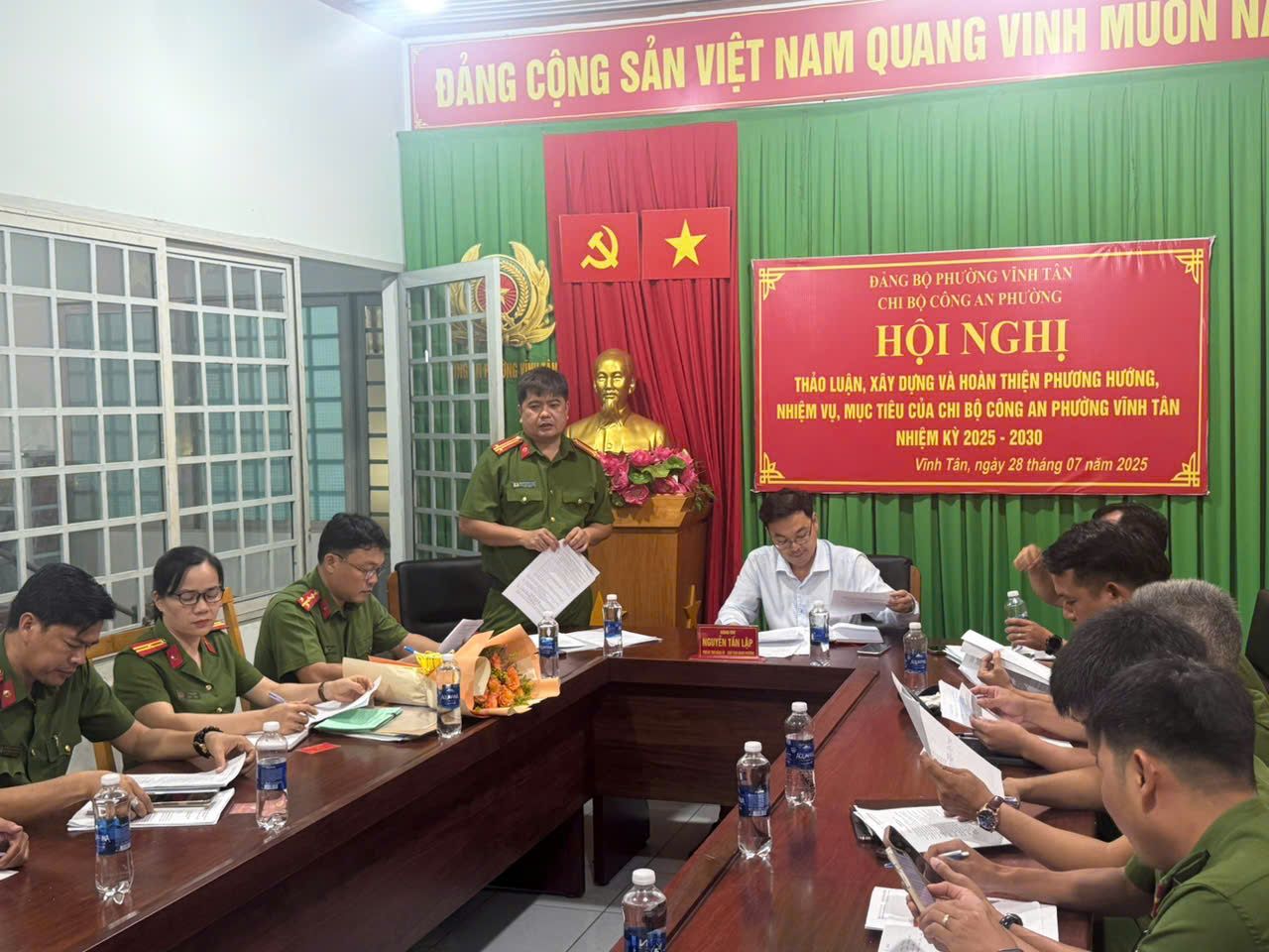 Ngày 28/7/2025, Chi bộ Công an phường Vĩnh Tân tổ chức hội nghị thảo luận, xây dựng và hoàn thiện phương hướng, nhiệm vụ, mục tiêu nhiệm kỳ 2025 - 2030; đồng thời sơ kết công tác xây dựng Đảng và công tác chuyên môn 6 tháng đầu năm, triển khai nhiệm vụ 6 tháng cuối năm 2025. Tham dự có đồng chí Nguyễn Tấn Lập – Phó Bí thư, Chủ tịch UBND phường; đồng chí Nguyễn Minh Sang - UVBTV, Trưởng Công an phường; các đồng chí trong chi bộ Công an phường.