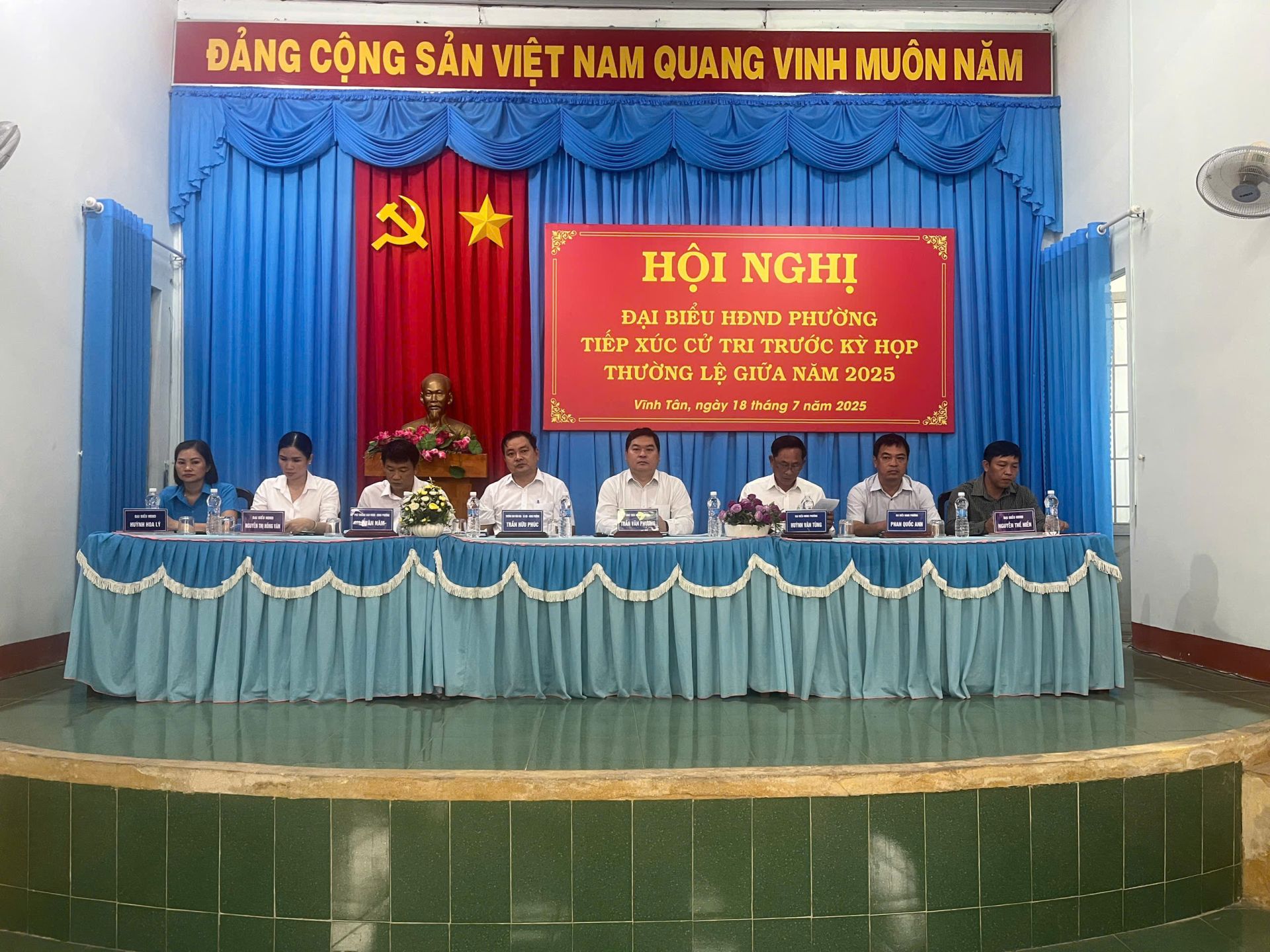 Cử tri bày tỏ niềm phấn khởi trước những kết quả mà phường Vĩnh Tân đã đạt được trong thời gian qua, cử tri các khu phố có những ý kiến, kiến nghị xoay quanh các vấn đề như: Nâng cấp các tuyến đường dân sinh tạo điều kiện thuận lợi cho bà con đi lại; Cần tăng cường công tác tuyên truyền để người dân nắm rõ những thủ đoạn lừa đảo mới của các loại tội phạm sử dụng công nghệ; Tuyến đường ĐT742 hiện nay xuống cấp nhưng lượng xe lưu thông rất nhiều kiến nghị sớm nâng cấp để thuận tiện lưu thông; cần lắp đặt đèn giao thông tại chợ Tân Bình để giảm tốc độ xe tránh xảy ra tai nạn giao thông.