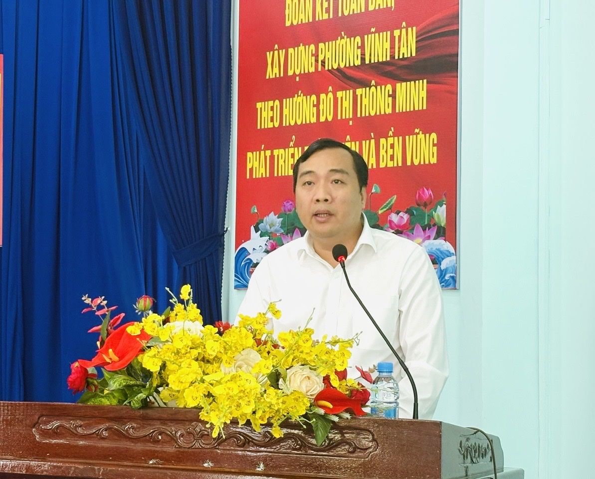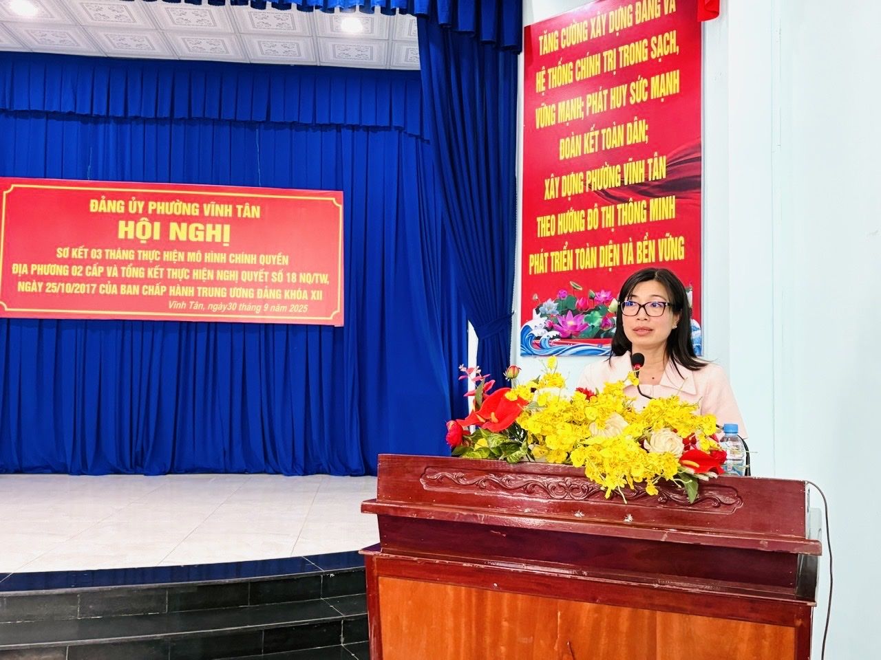 Sáng ngày 30/9, Đảng ủy phường Vĩnh Tân tổ Hội nghị sơ kết 03 tháng thực hiện chính quyền địa phương 02 cấp và tổng kết việc thực hiện Nghị quyết số 18-NQ/TW ngày 25/10/2017 của Ban Chấp hành Trung ương khóa XII “Một số vấn đề về tiếp tục đổi mới, sắp xếp tổ chức bộ máy của hệ thống chính trị tinh gọn, hoạt động hiệu lực, hiệu quả”. Tham dự hội nghị có đồng chí Nguyễn Thị Kim Nguyên – Phó Trưởng ban Ban Tuyên giáo và Dân vận Thành ủy; đồng chí Trần Văn Phương – Bí thư Đảng ủy, Chủ tịch HĐND phường; đồng chí Mai Thị Đạt – Phó Bí thư thường trực Đảng ủy cùng Trưởng, phó các ban, ngành, đoàn thể phường; Bí thư, Phó Bí thư các chi, Đảng bộ trực thuộc.