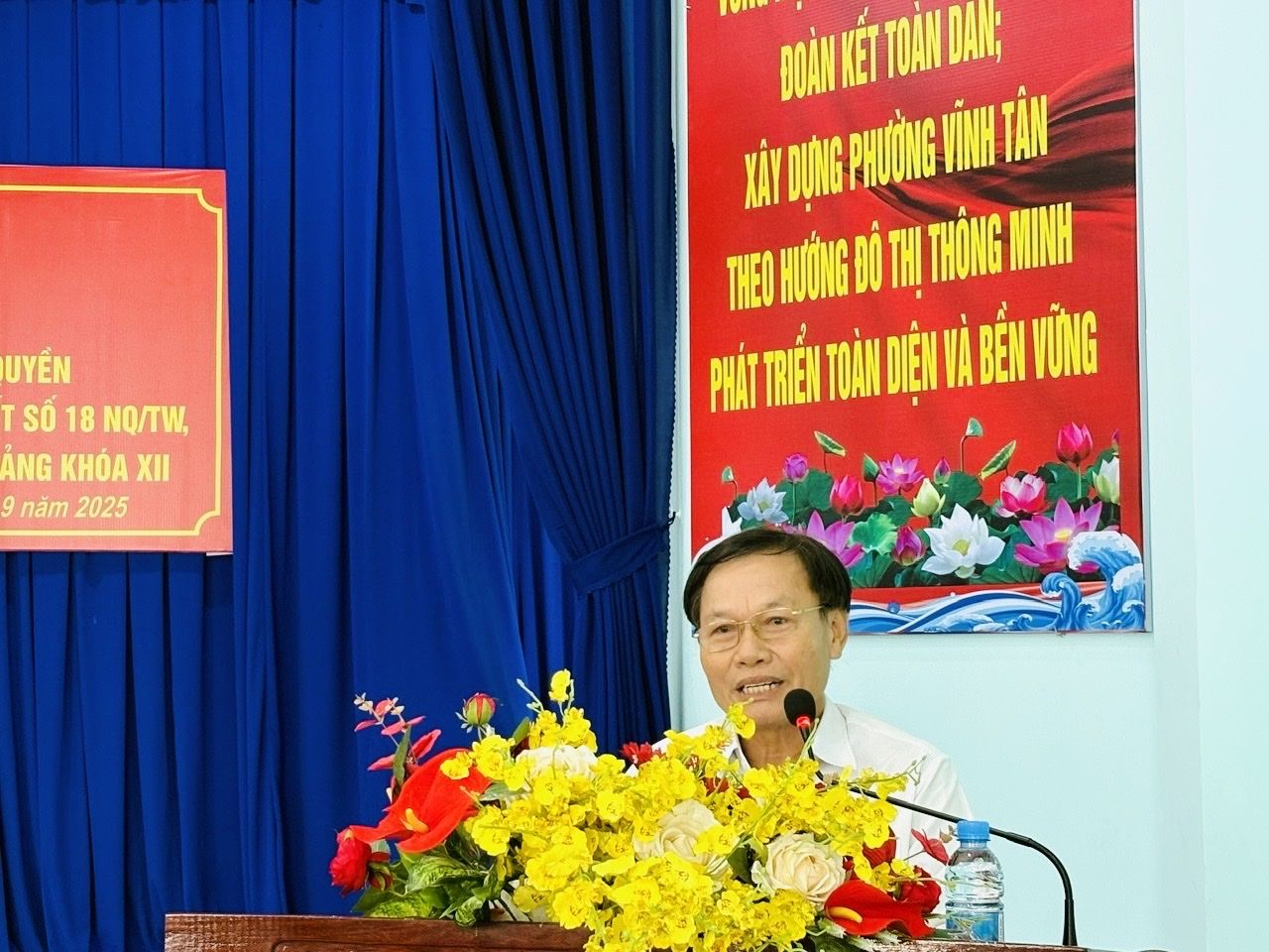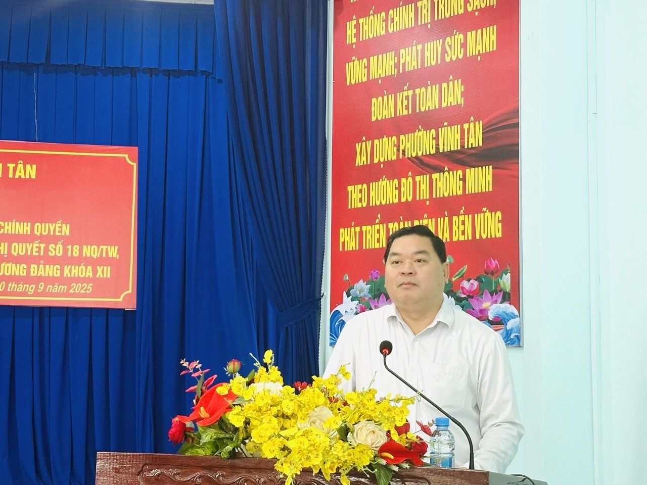 Thực hiện Nghị quyết 18-NQ/TW của Trung ương về tinh gọn bộ máy, phường Vĩnh Tân triển khai đồng bộ nhiều giải pháp: rà soát, sắp xếp chức năng – nhiệm vụ; bố trí kiêm nhiệm hợp lý; giảm đầu mối trung gian; nâng cao chất lượng cán bộ và hiệu quả quản lý nhà nước. Công tác nhân sự được thực hiện công khai, đúng người – đúng việc, kết hợp với đào tạo chuyên môn, kỹ năng chuyển đổi số, hành chính công, dân vận… tạo chuyển biến tích cực trong tổ chức và vận hành bộ máy. Thời gian qua, Đảng ủy, Ban Thường vụ Đảng ủy đã nghiêm túc tổ chức học tập, quán triệt và triển khai thực hiện Nghị quyết số 18 đảm bảo chặt chẽ, đúng định hướng, đúng nội dung, tạo nên đợt sinh hoạt chính trị sâu rộng trên địa bàn toàn phường. Lãnh đạo thực hiện mô hình chính quyền mới, sắp xếp, quản lý tổ chức bộ máy, biên chế đảm bảo tính tổng thể, đồng bộ, liên thông. Gắn đổi mới tổ chức bộ máy với đổi mới phương thức lãnh đạo. Cơ cấu lại và nâng cao chất lượng đội ngũ cán bộ, công chức, viên chức.