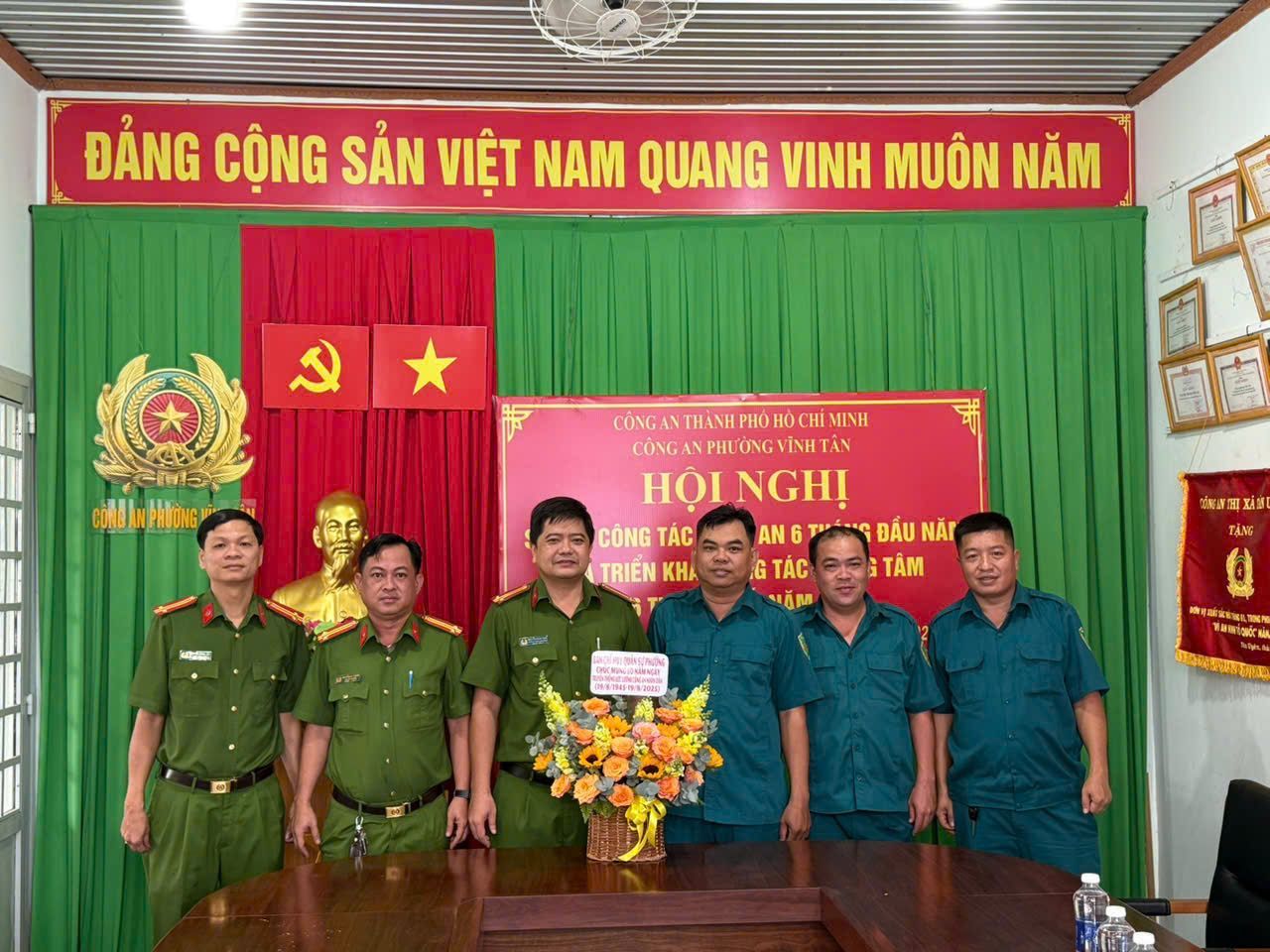 Sáng ngày 18/8/2024, Đoàn lãnh đạo phường Vĩnh Tân có các đồng chí TRần Văn Phương – Bí thư Đảng ủy, Chủ tịch HĐND phường; đồng chí Mai Thị Đạt, Phó Bí thư thường trực Đảng ủy; đồng chí Nguyễn Tấn Lập, Phó Bí thư, Chủ tịch UBND phường đã đến thăm, chúc mừng lực lượng Công an phường nhân kỷ niệm 80 năm Ngày truyền thống Công an nhân dân Việt Nam (19/8/1945-19/8/2025), 19 năm Ngày hội toàn dân bảo vệ An ninh Tổ quốc (19/8/2005- 19/8/2025). Tiếp đoàn có Trung tá Nguyễn Minh Sang, UVTV Đảng ủy, Trưởng Công an phường, các đồng chí Phó Trưởng Công an phường, các Tổ Nghiệp vụ Công an phường.