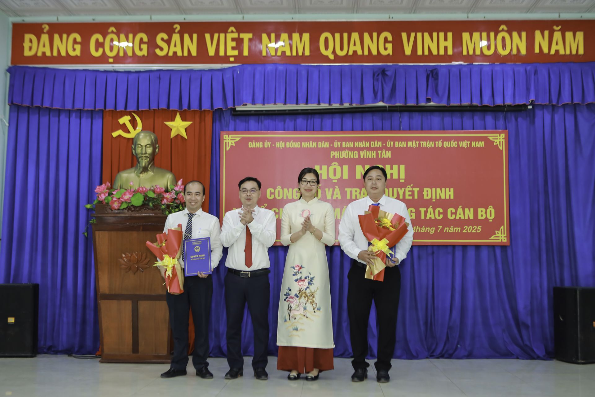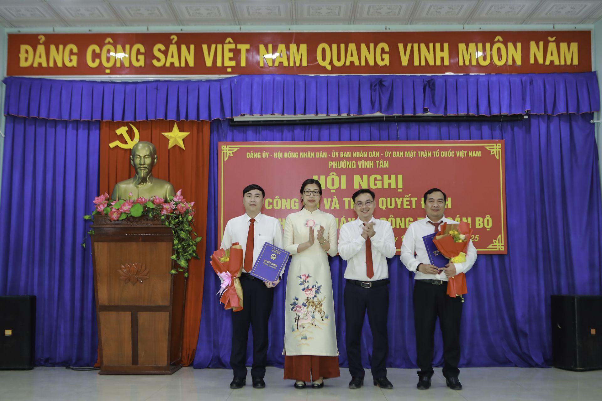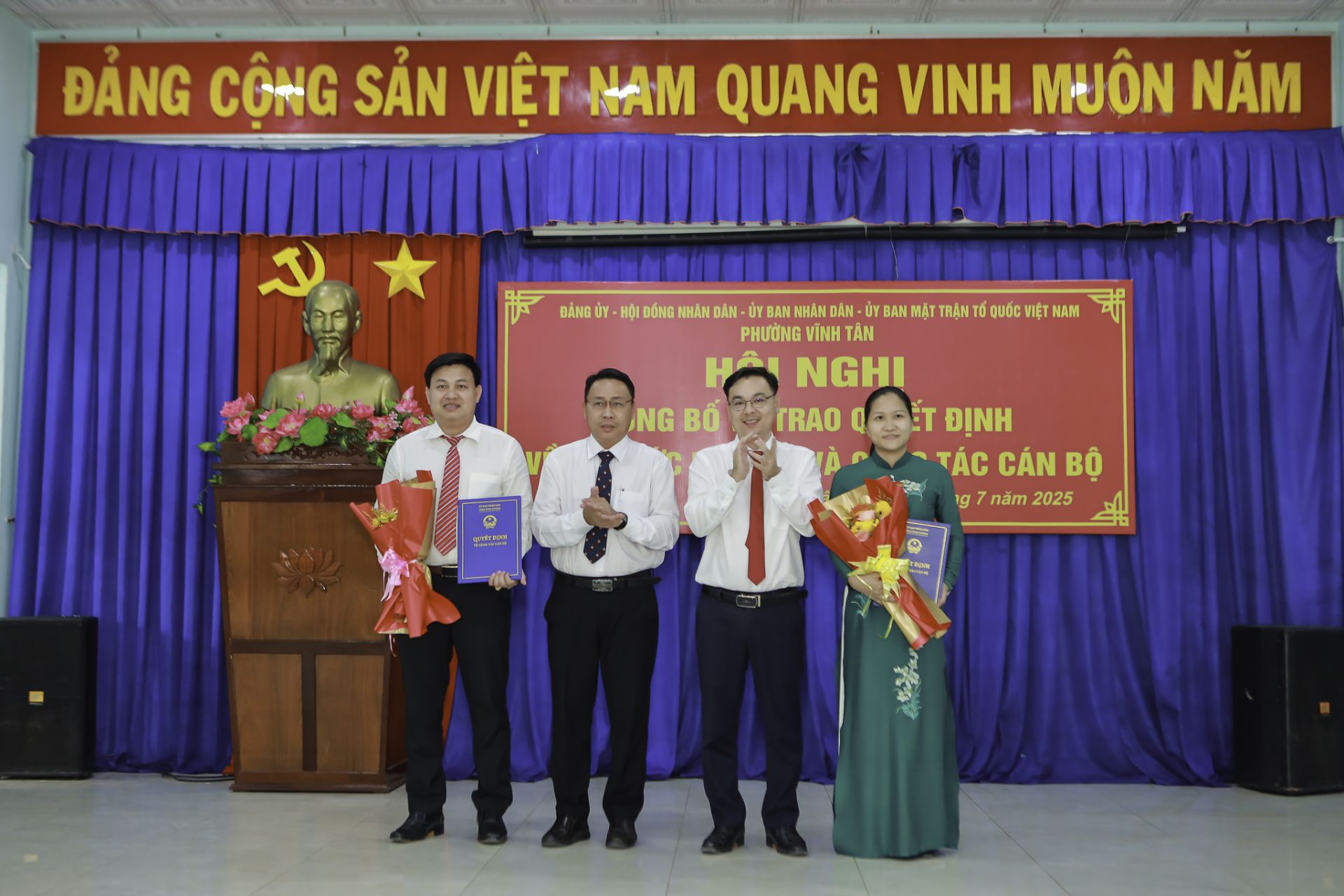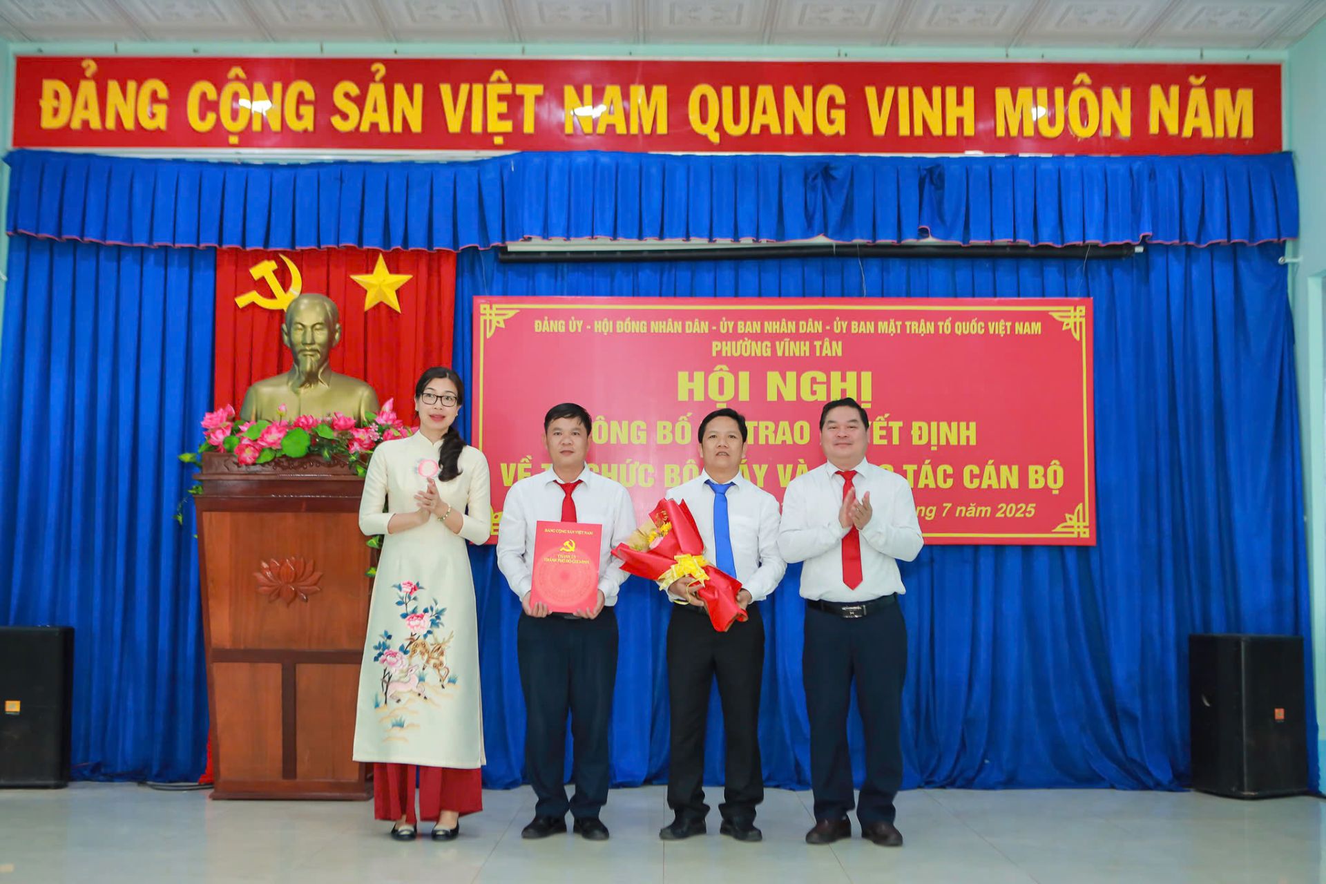 Ngày 10/7/2025, tại Hội trường HĐND - UBND phường, Đảng ủy – HĐND – UBND – Ủy ban MTTQ Việt Nam phường Vĩnh Tân tổ chức Hội nghị công bố và trao các Nghị quyết, Quyết định của Thành ủy, UBND thành phố Hồ Chí Minh và các Quyết định của phường Vĩnh Tân về kiện toàn tổ chức bộ máy, công tác cán bộ theo mô hình chính quyền địa phương hai cấp.