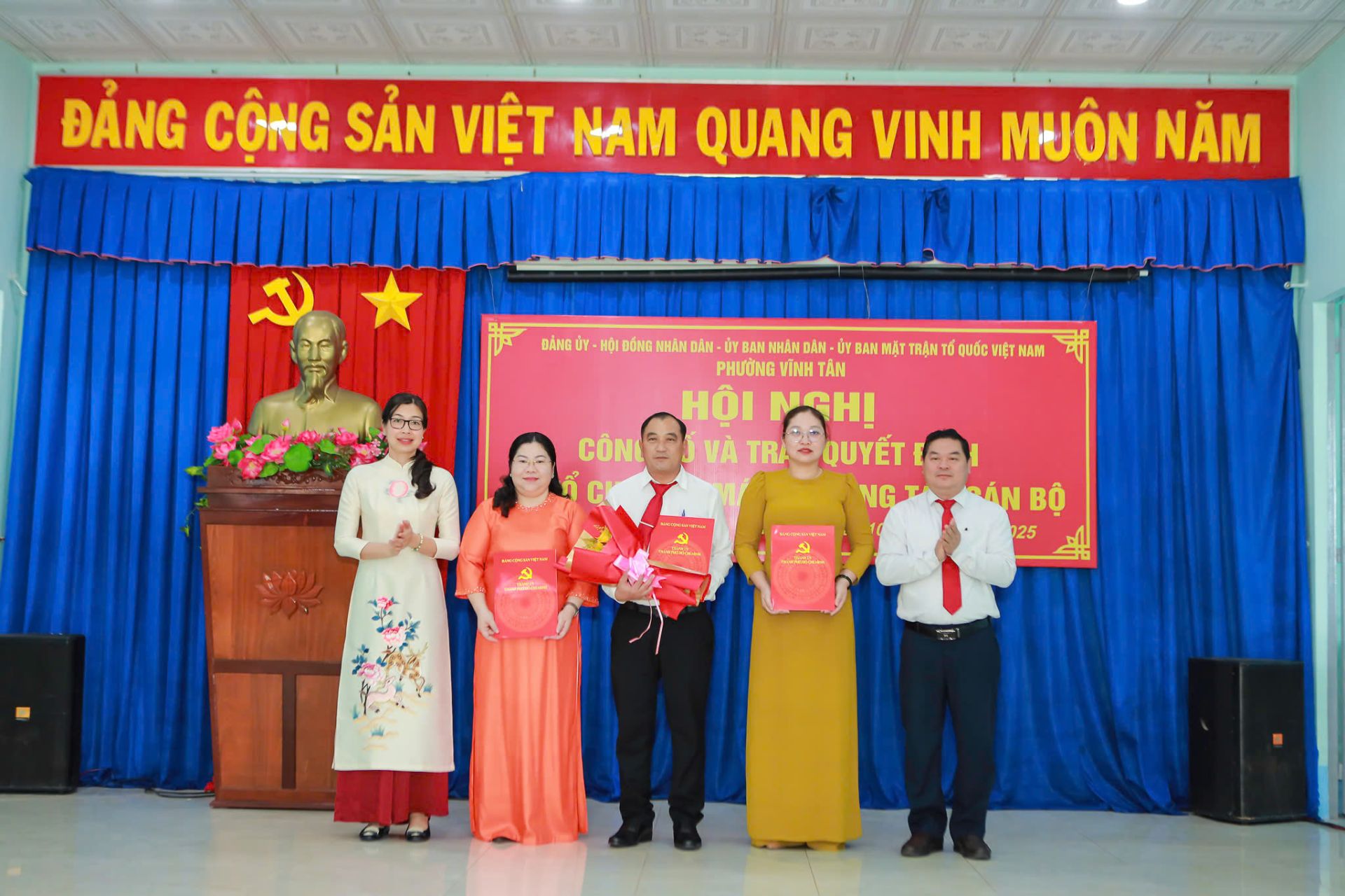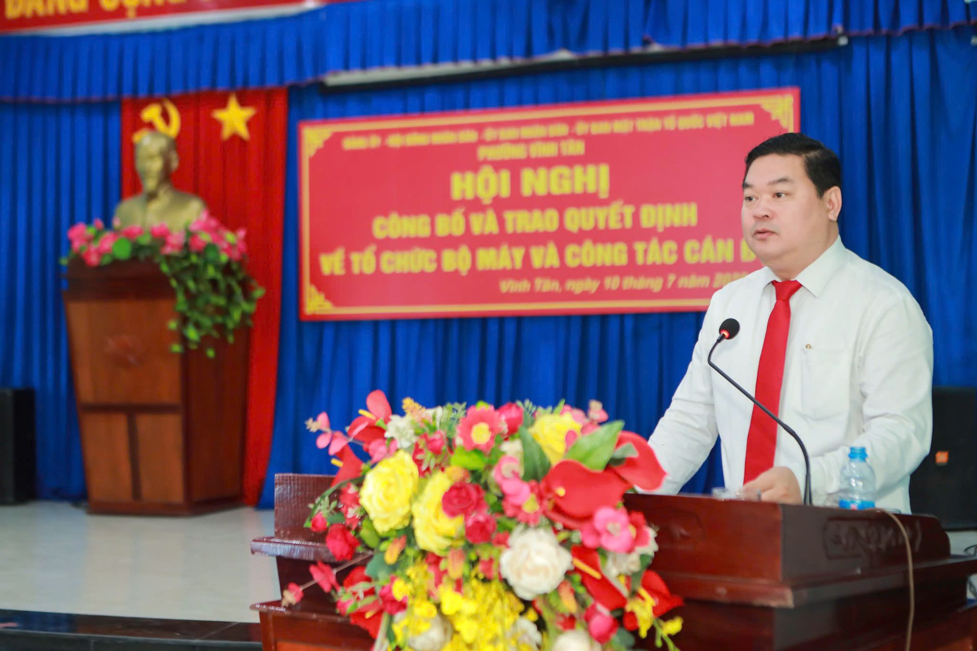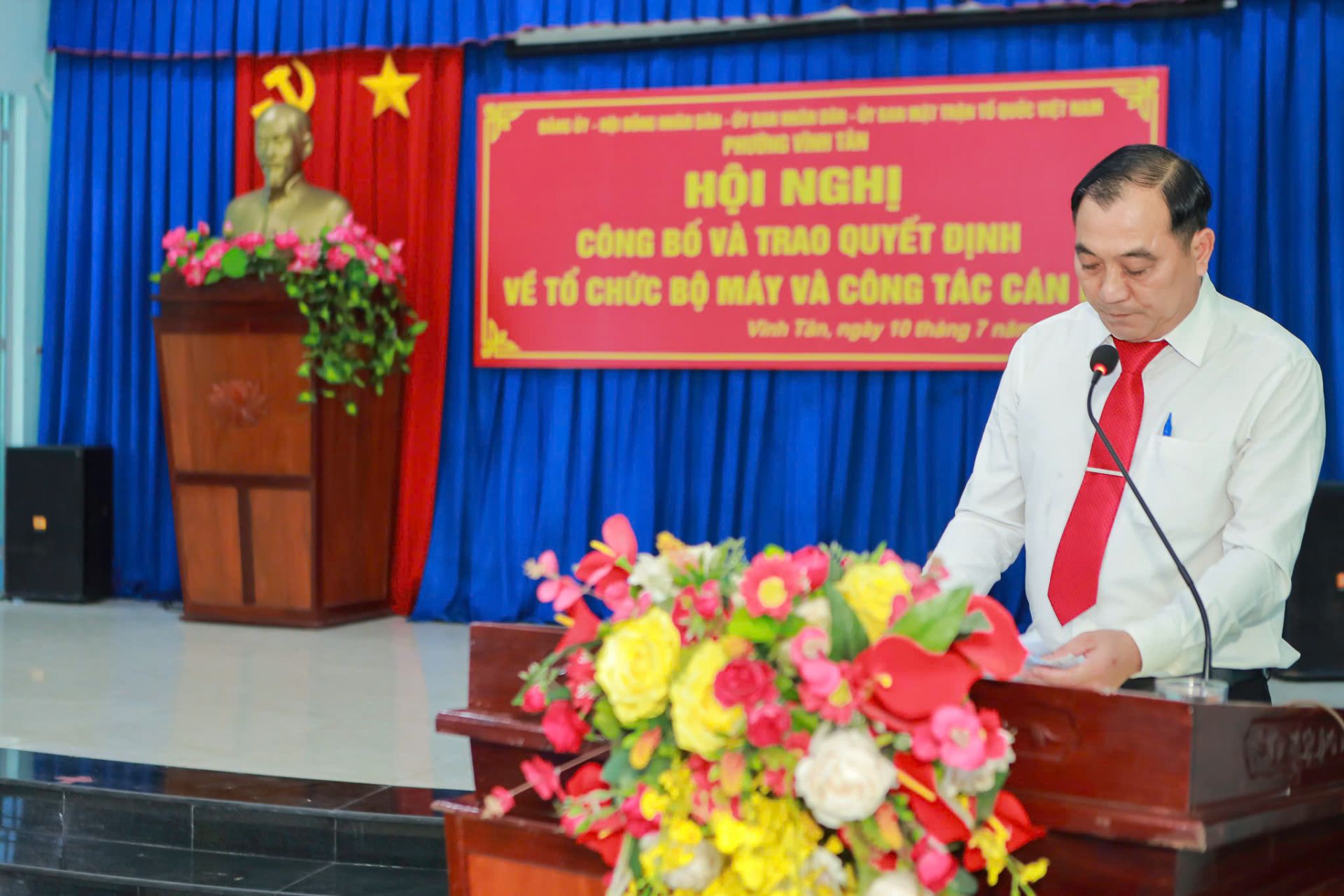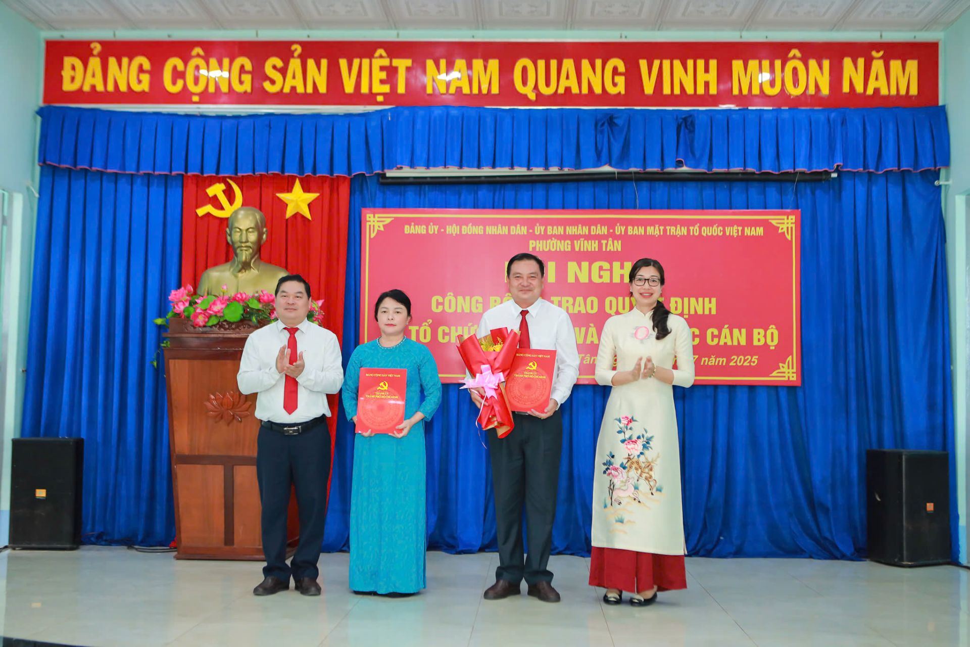 Ngày 10/7/2025, tại Hội trường HĐND - UBND phường, Đảng ủy – HĐND – UBND – Ủy ban MTTQ Việt Nam phường Vĩnh Tân tổ chức Hội nghị công bố và trao các Nghị quyết, Quyết định của Thành ủy, UBND thành phố Hồ Chí Minh và các Quyết định của phường Vĩnh Tân về kiện toàn tổ chức bộ máy, công tác cán bộ theo mô hình chính quyền địa phương hai cấp.