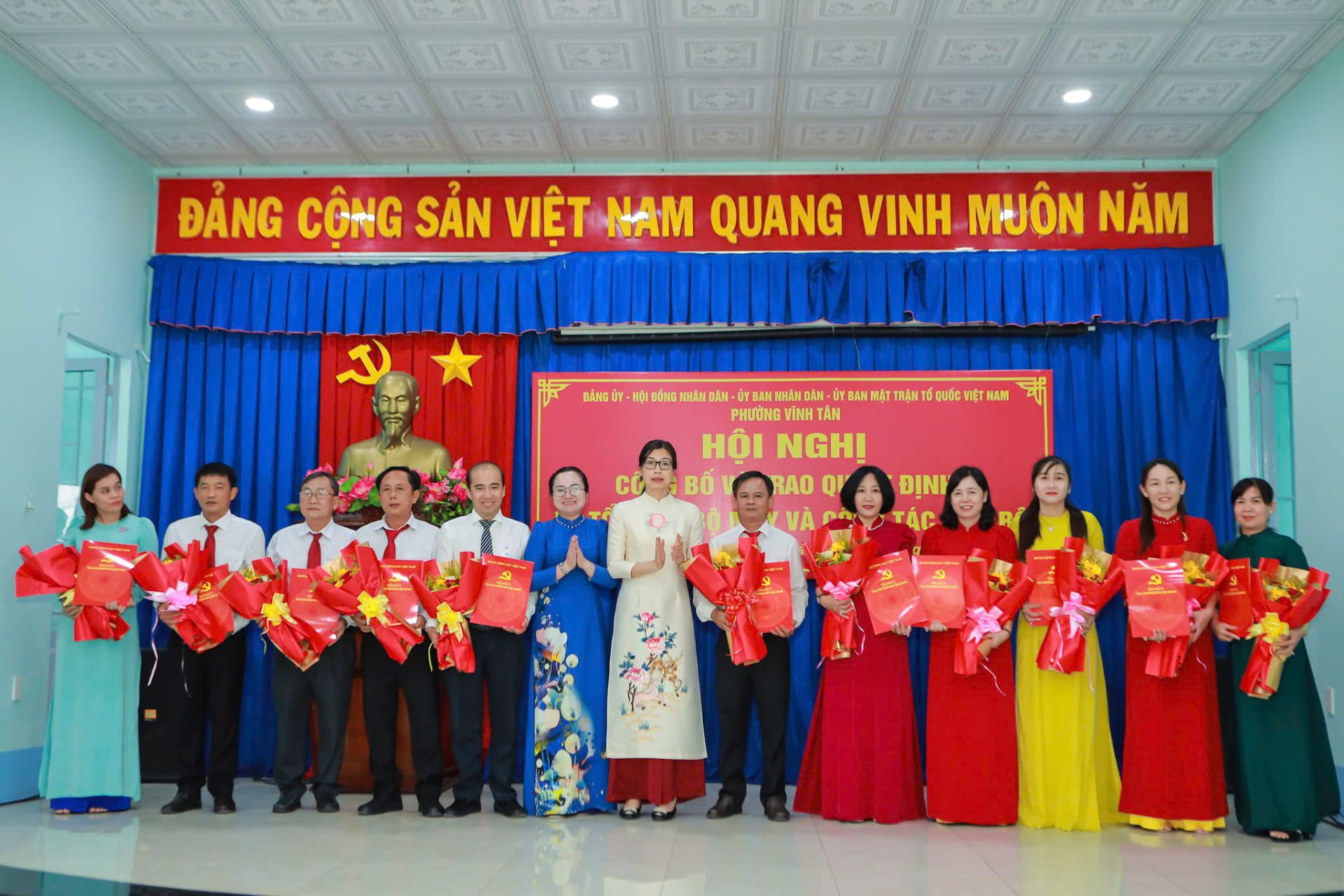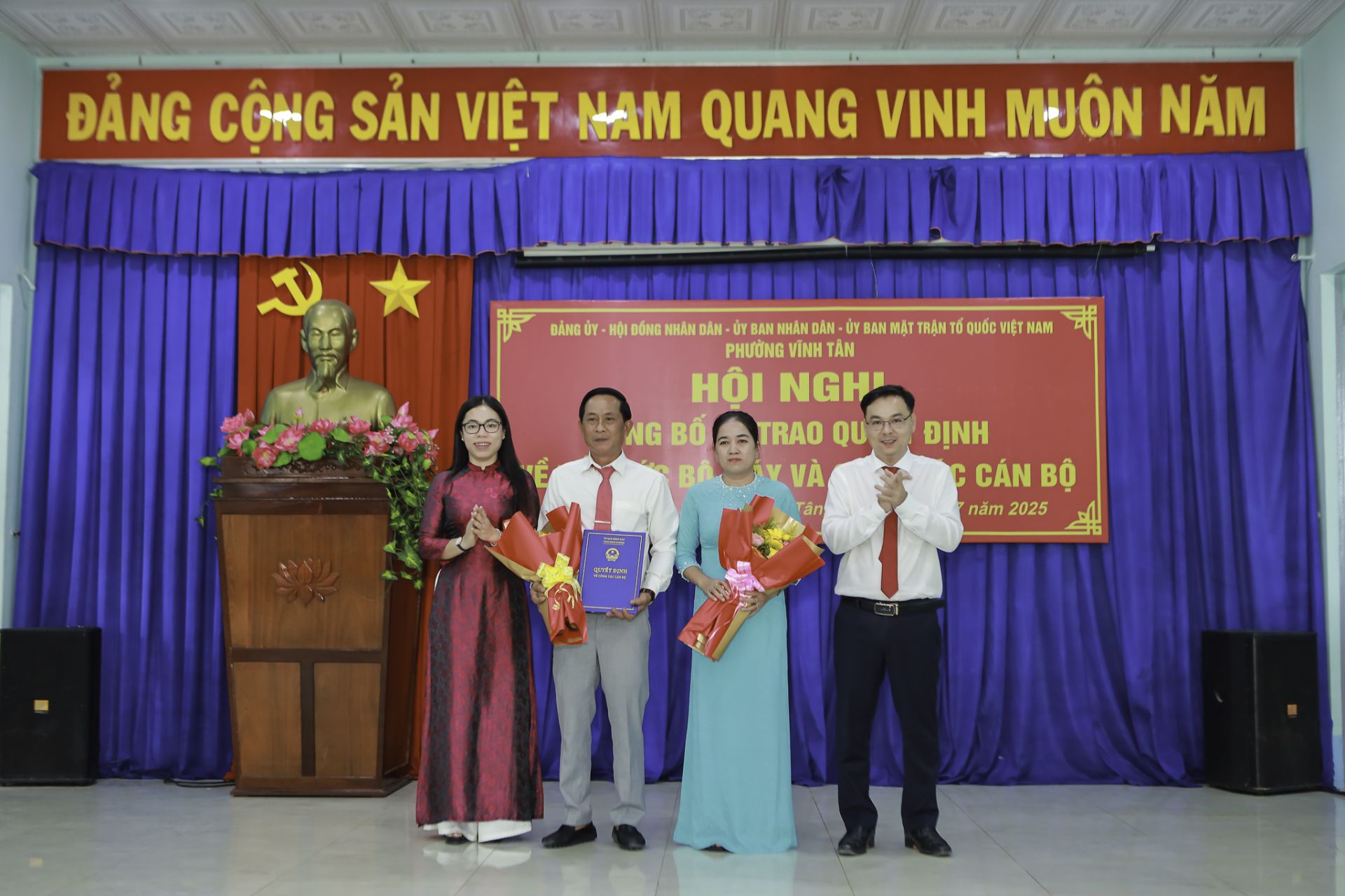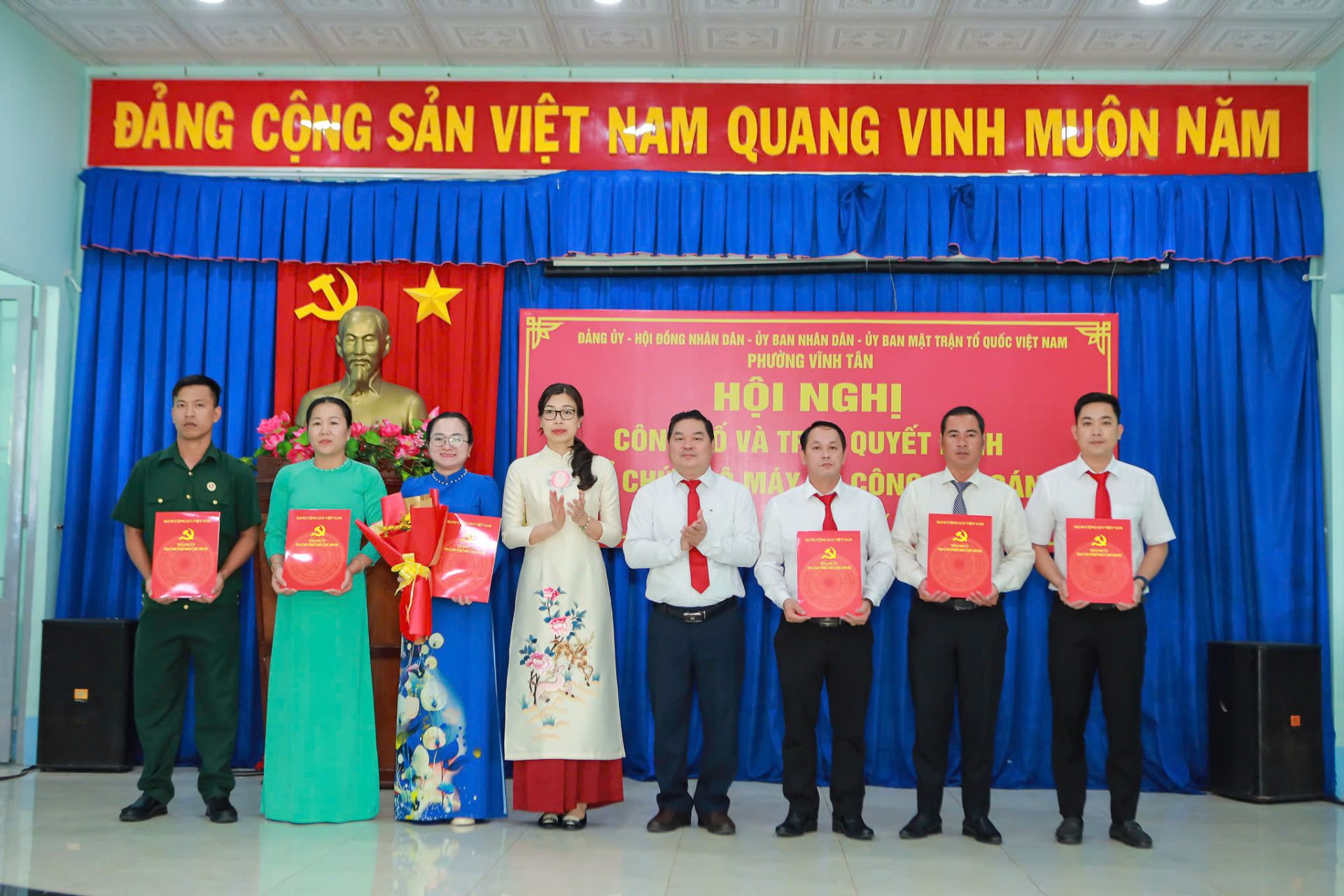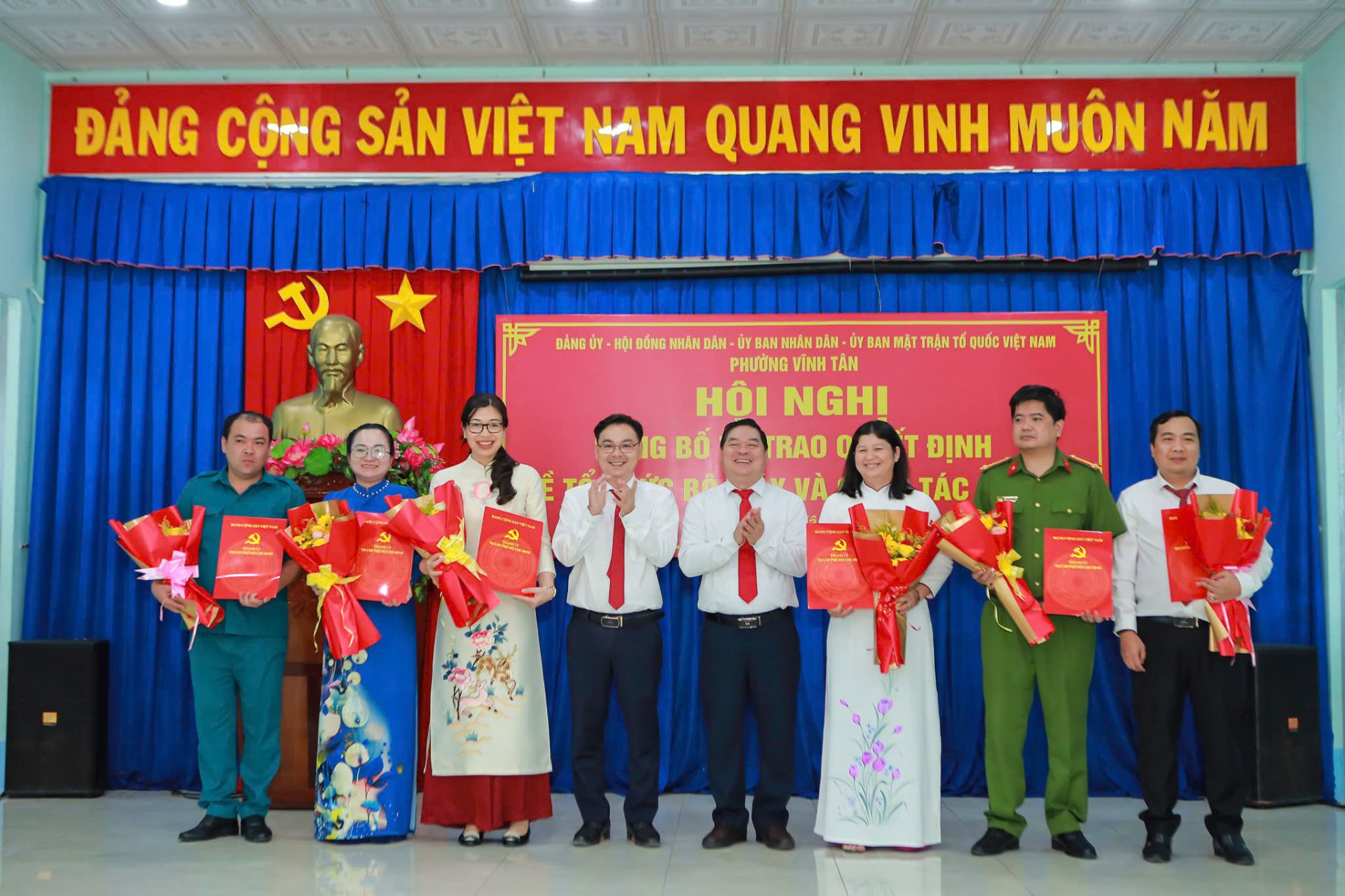Ngày 10/7/2025, tại Hội trường HĐND - UBND phường, Đảng ủy – HĐND – UBND – Ủy ban MTTQ Việt Nam phường Vĩnh Tân tổ chức Hội nghị công bố và trao các Nghị quyết, Quyết định của Thành ủy, UBND thành phố Hồ Chí Minh và các Quyết định của phường Vĩnh Tân về kiện toàn tổ chức bộ máy, công tác cán bộ theo mô hình chính quyền địa phương hai cấp.