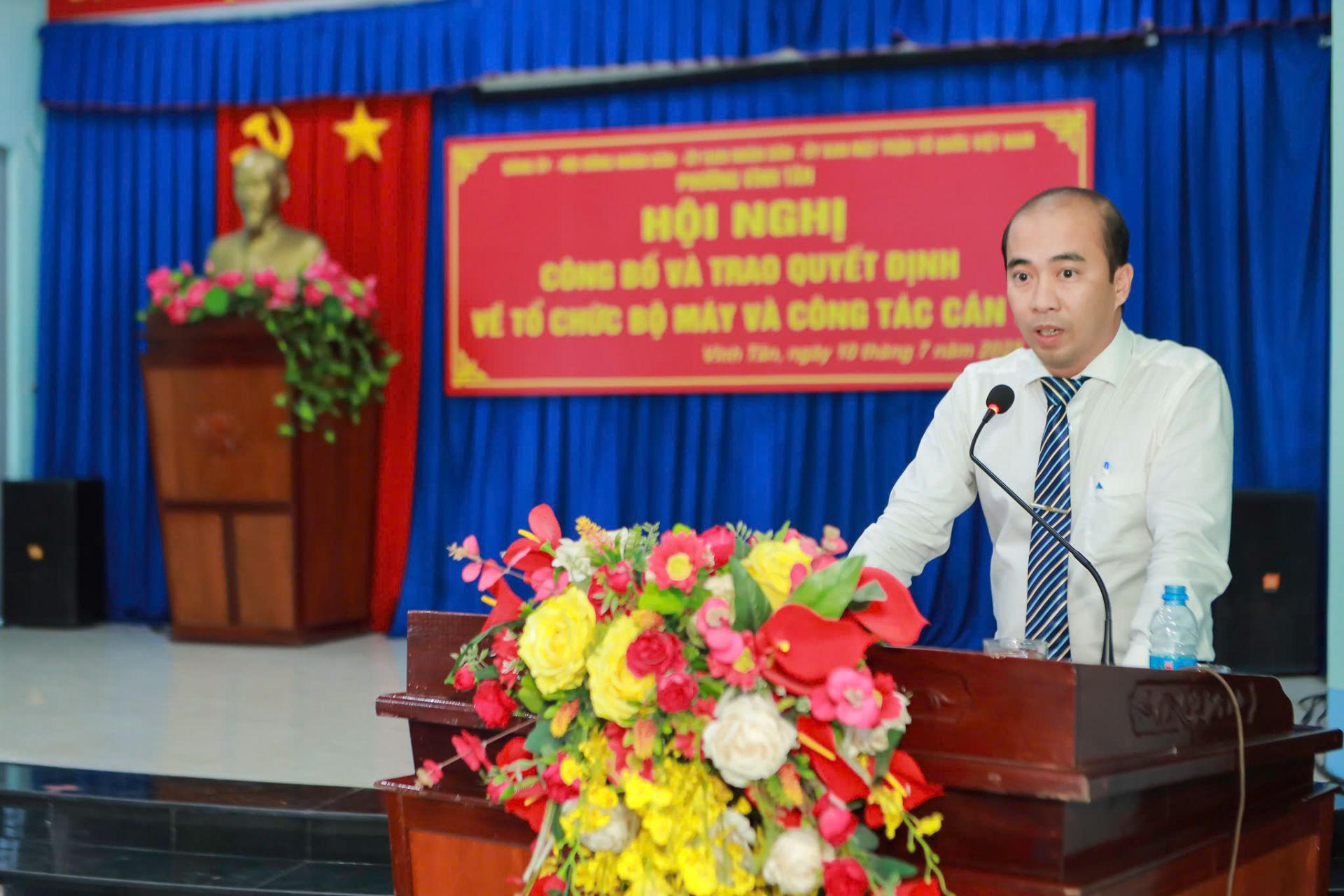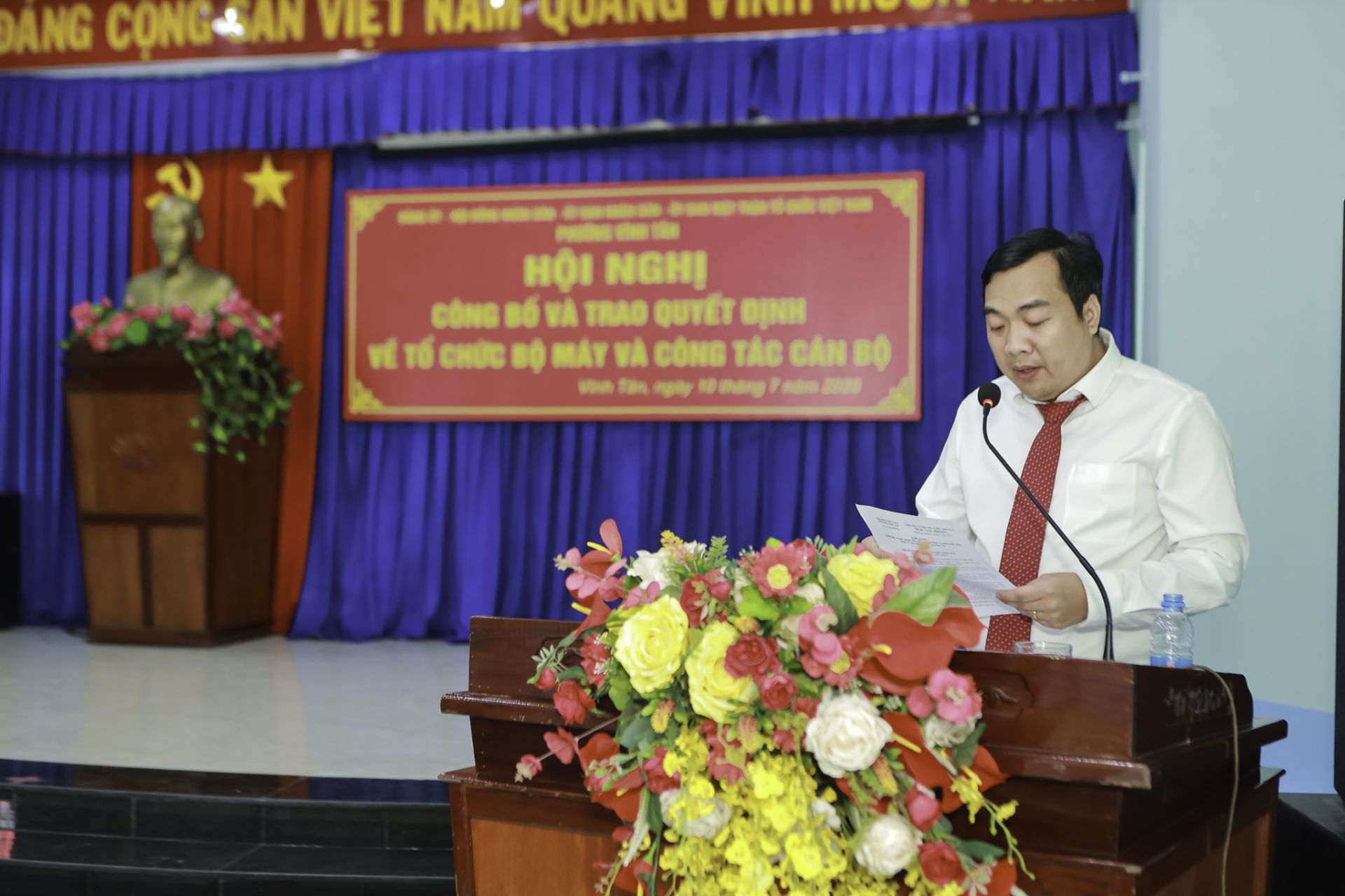 Đồng chí Nguyễn Kiến Phúc - Ủy viên Ban thường vụ Đảng ủy – Phó Chủ tịch UBND phường công bố các Quyết định về tổ chức bộ máy và công tác cán bộ UBND phường Vĩnh Tân.