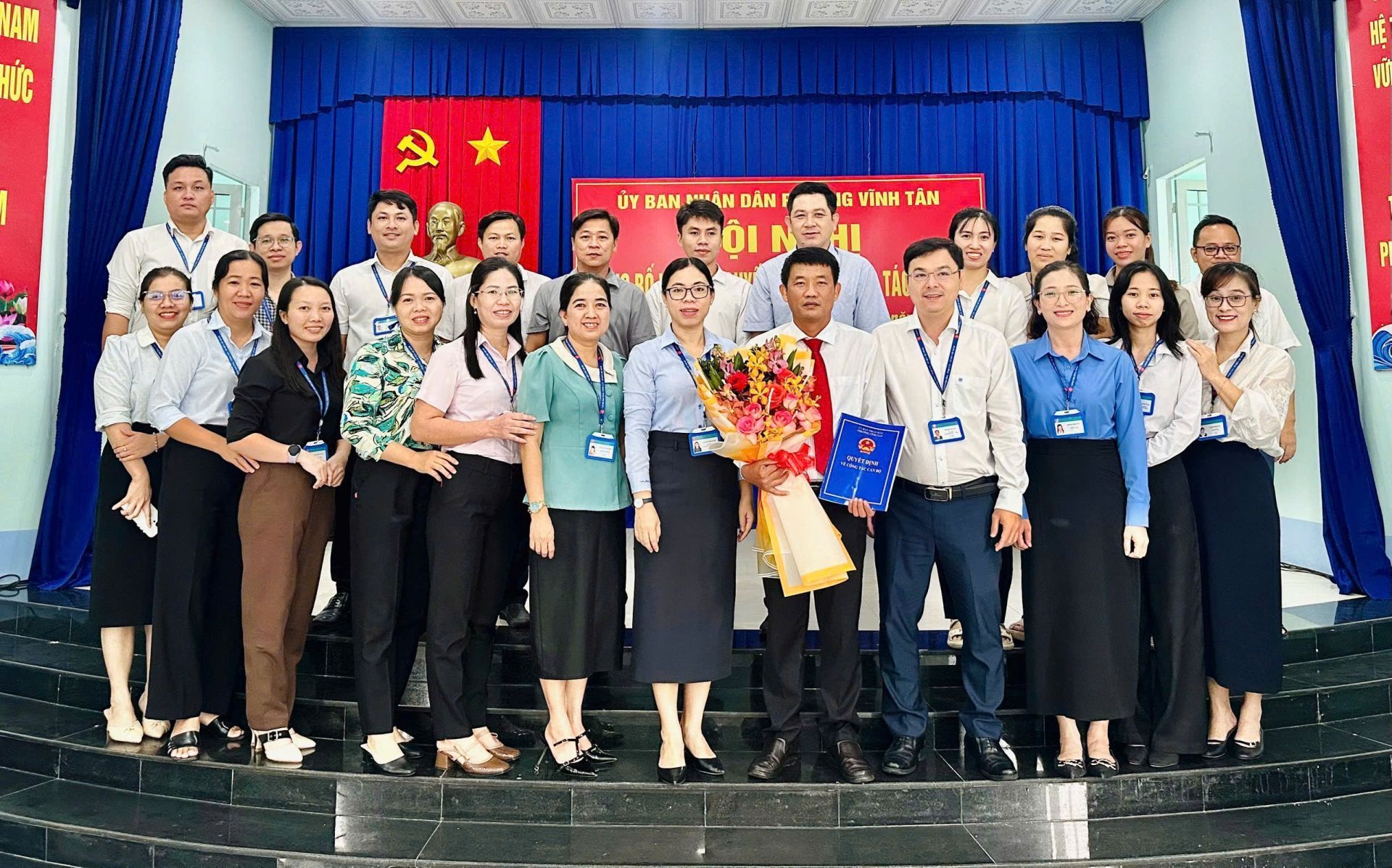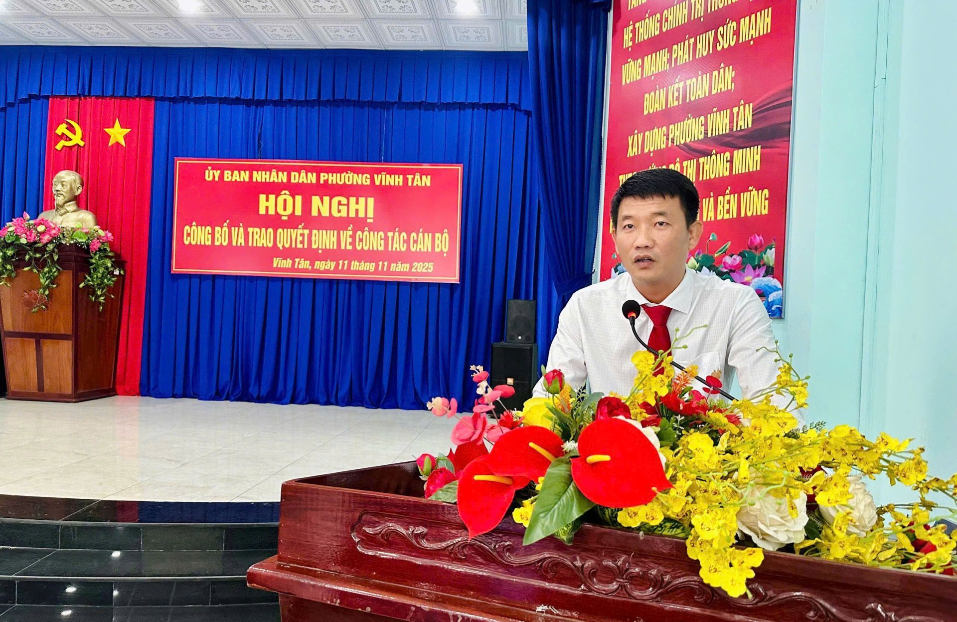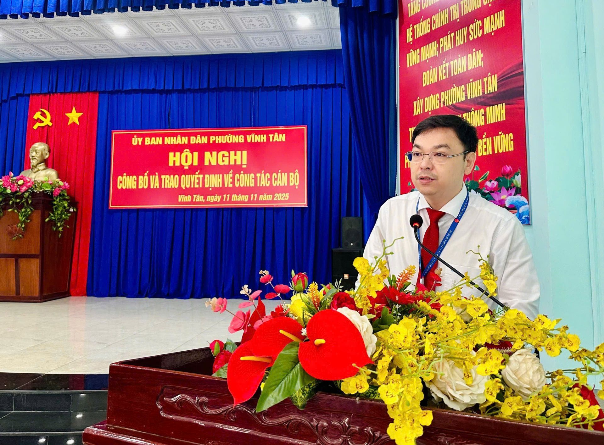 Sáng ngày 11/11/2025, UBND phường Vĩnh Tân tổ chức Hội nghị công bố Quyết định của Chủ tịch UBND phường về công tác cán bộ. Dự và trao quyết định có đồng chí Mai Thị Đạt, Phó Bí thư thường trực Đảng uỷ; đồng chí Nguyễn Tấn Lập, Phó Bí thư, Chủ tịch UBND phường; cùng các đồng chí trong Các đồng chí Ủy viên BTV, Ủy viên Ban Chấp hành Đảng bộ phường; Hiệu trưởng các trường trên địa bàn phường; Bí thư chi bộ, Ban điều hành các khu phố.