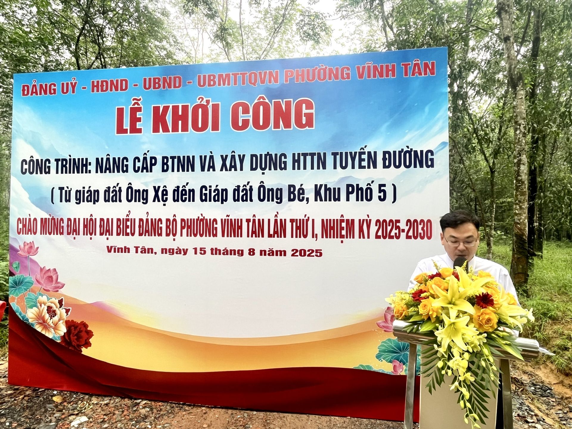 Phát biểu tại Lễ khởi công, đồng chí Nguyễn Tấn Lập, Phó bí thư Đảng ủy, Chủ tịch UBND phường cho biết: Tuyến đường được nâng cấp, trải nhựa, góp phần hoàn thiện hạ tầng giao thông, tạo điều kiện thuận lợi cho người dân đi lại, giao thương, học tập và sinh hoạt, đảm bảo an toàn giao thông, đặc biệt trong mùa mưa; góp phần mang đến diện mạo mới cho phường. Đồng thời, đây còn là công trình đầy ý nghĩa của chính quyền và nhân dân phường nhằm chào mừng Đại hội đại biểu Đảng bộ phường Vĩnh Tân lần thứ I, nhiệm kỳ 2025-2030; là sự kiện chính trị trọng đại, mở ra một giai đoạn phát triển mới, đầy triển vọng. Để công trình đảm bảo chất lượng, tiến độ và hiệu quả sử dụng lâu dài, Chủ tịch UBND phường đề nghị Phòng Kinh tế, Hạ tầng và Đô thị, các cơ quan, đơn vị liên quan cùng Nhân dân chấp hành, hỗ trợ, tạo mọi điều kiện thuận lợi nhất để công trình sớm được thi công xây dựng hoàn thành đưa vào sử dụng, đặc biệt là chất lượng, thẩm mỹ và tiến độ phải tốt nhất.
