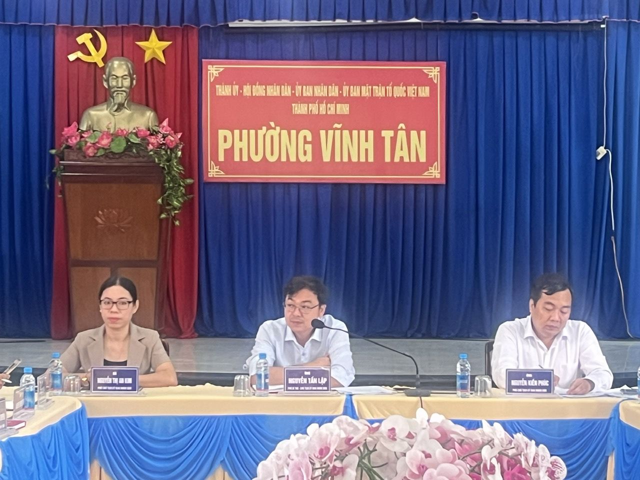 Tại buổi làm việc UBND phường Vĩnh Tân thông tin nhanh về hình hoạt động của UBND phường sau sáp nhập phường Vĩnh Tân và Thị trấn Tân Bình. Ngay sau khi nghe lãnh đạo địa phương thông tin về hoạt động của địa phương sau sáp nhập. Trưởng ban điều hành 11 khu phố cũng nêu các vấn đề mà từng khu phố đang đối mặt. Trong đó, môi trường, chăn nuôi và đường giao thông được xác định là những lĩnh vực cần được quan tâm giải quyết kịp thời. Các trưởng Ban điều hành đã chia sẻ những thách thức cụ thể như tình trạng ô nhiễm môi trường do rác thải chưa được xử lý triệt để; ảnh hưởng từ hoạt động chăn nuôi nhỏ lẻ gây mùi hôi và nguy cơ mất vệ sinh; cùng với đó là một số đoạn đường giao thông xuống cấp, gây khó khăn trong đi lại của người dân; thi công hệ thống cống thoát nước còn ảnh hưởng đất của người dân; …