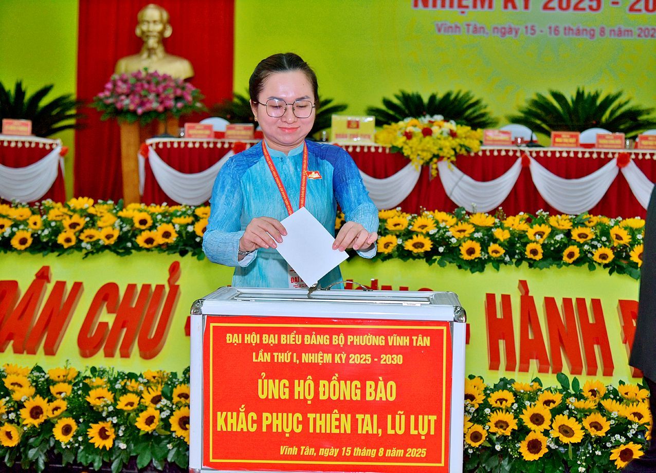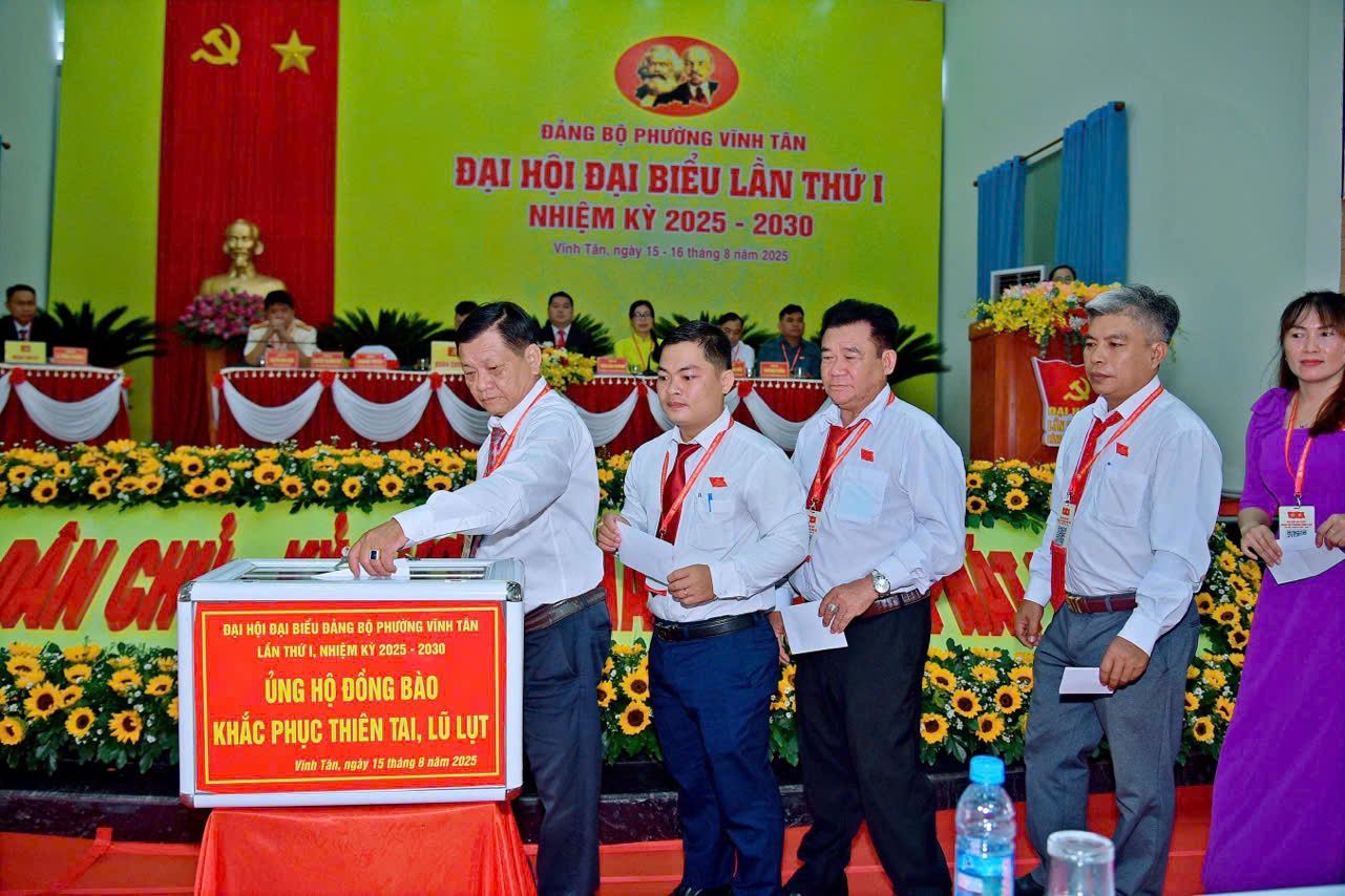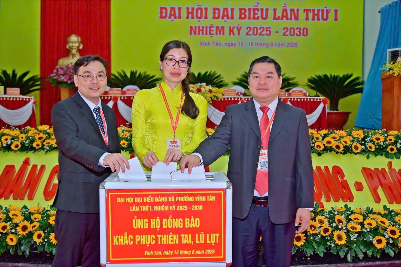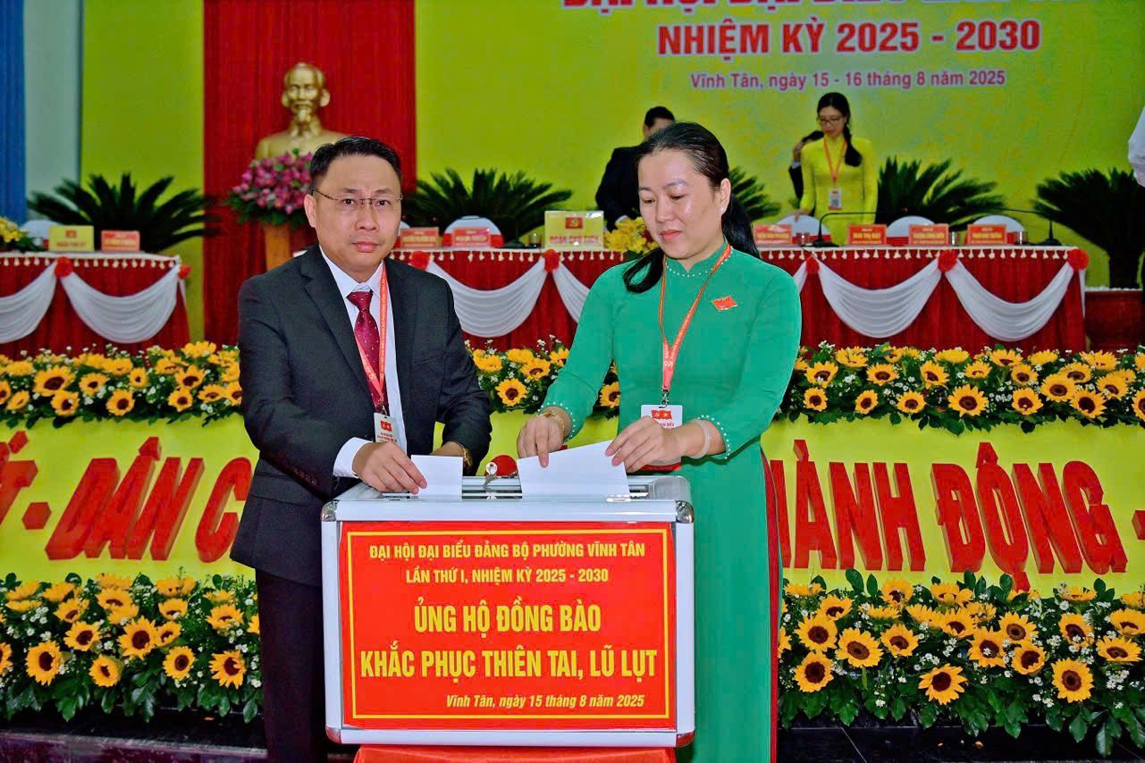 Hưởng ứng lời kêu gọi của Ban Thường vụ Thành ủy Thành phố Hồ Chí Minh tại Công văn số 45-CV/TU ngày 06/8/2025, trong phiên làm việc trù bị diễn ra vào chiều ngày 15/8/2025 tại Hội trường Trung tâm văn hóa và học tập cộng đồng phường Vĩnh Tân, Đại hội Đại biểu Đảng bộ phường Vĩnh Tân lần thứ I, nhiệm kỳ 2025 - 2030 đã phát động quyên góp ủng hộ đồng bào các tỉnh miền núi và trung du Bắc Bộ, Bắc Trung Bộ - những địa phương đang phải gánh chịu hậu quả nặng nề do mưa lũ gây ra.