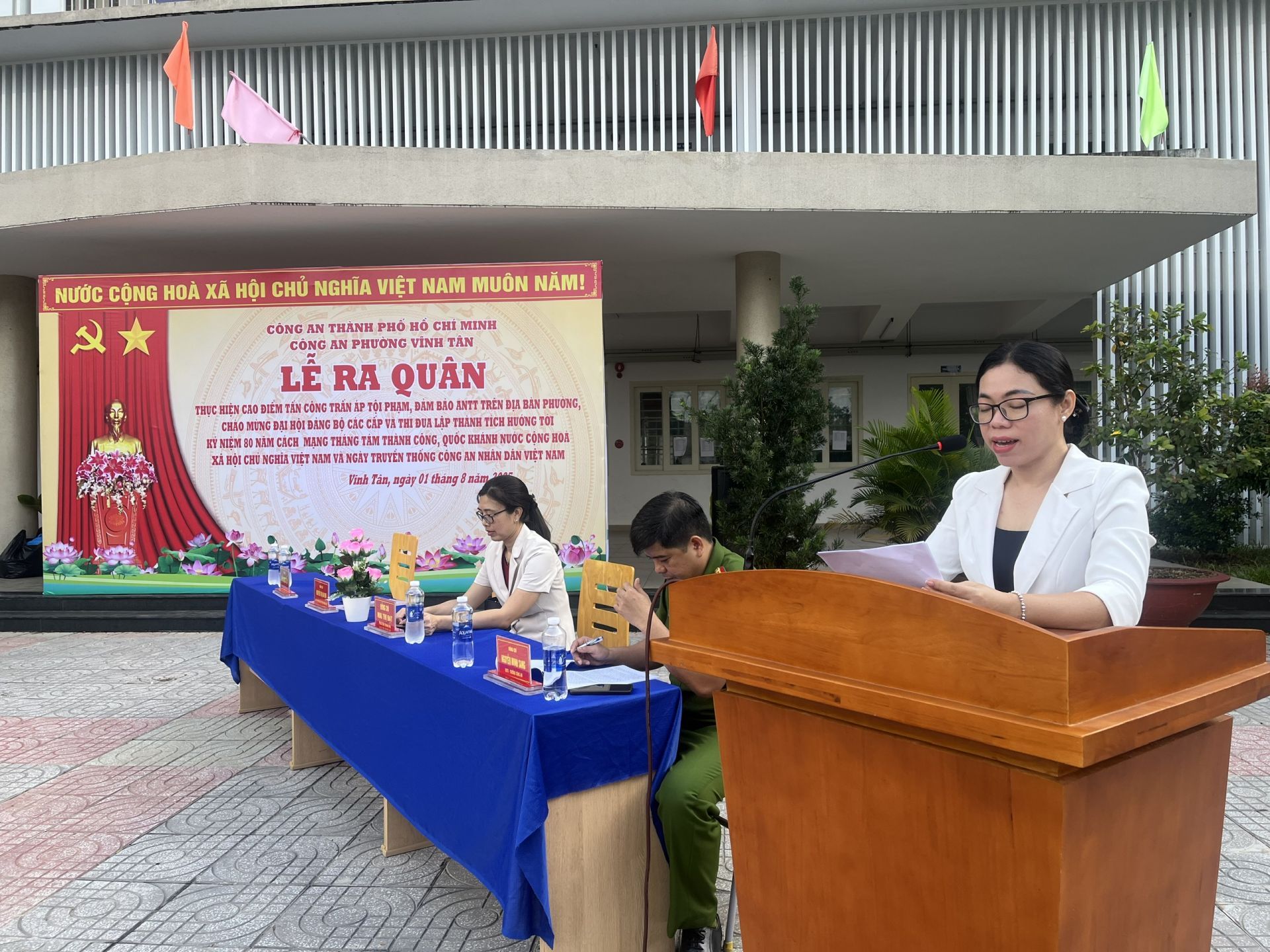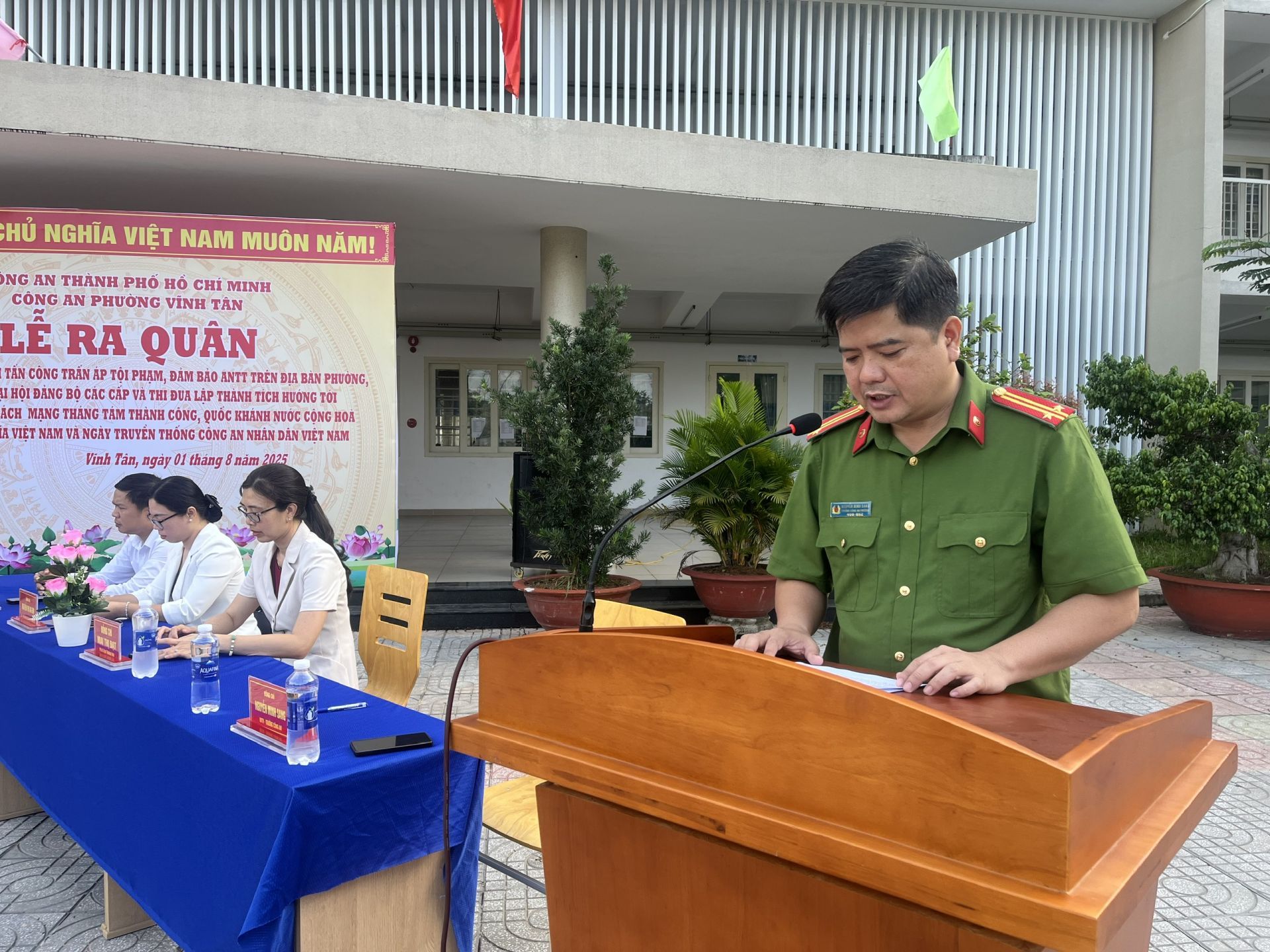 Sáng ngày 01/8, Công an phường Vĩnh Tân tổ chức Lễ ra quân thực hiện cao điểm tấn công trấn áp tội phạm, đảm bảo an ninh trật tự, chào mừng Đại hội Đảng các cấp và thi đua lập thành tích hướng tới kỷ niệm 80 năm Cách mạng Tháng Tám thành công (19/8/1945 - 19/8/2025), Quốc khánh nước Cộng hòa Xã hội chủ nghĩa Việt Nam (02/9/1945 - 02/9/2025) và ngày truyền thống Công an nhân dân Việt Nam (19/8/1945-19/8/2025). Tham dự buổi lễ có bà Mai Thị Đạt - Phó Bí thư thường trực Đảng ủy phường; bà Nguyễn Thị An Kim - Ủy viên Ban chấp hành Đảng ủy, Phó Chủ tịch UBND phường cùng đông đảo cán bộ, chiến sĩ công an, lực lượng dân quân, lực lượng bảo vệ an ninh ở cơ sở.