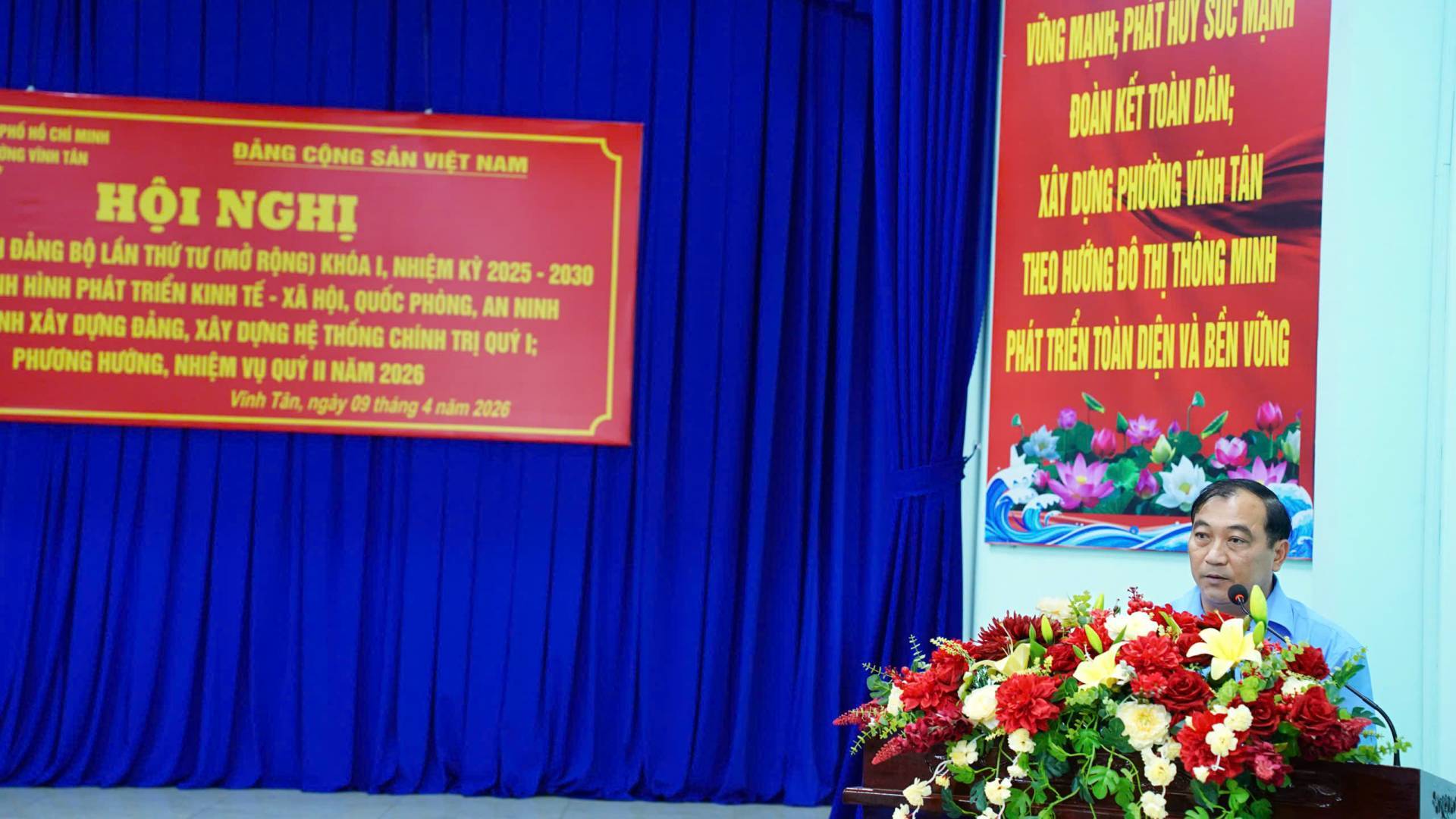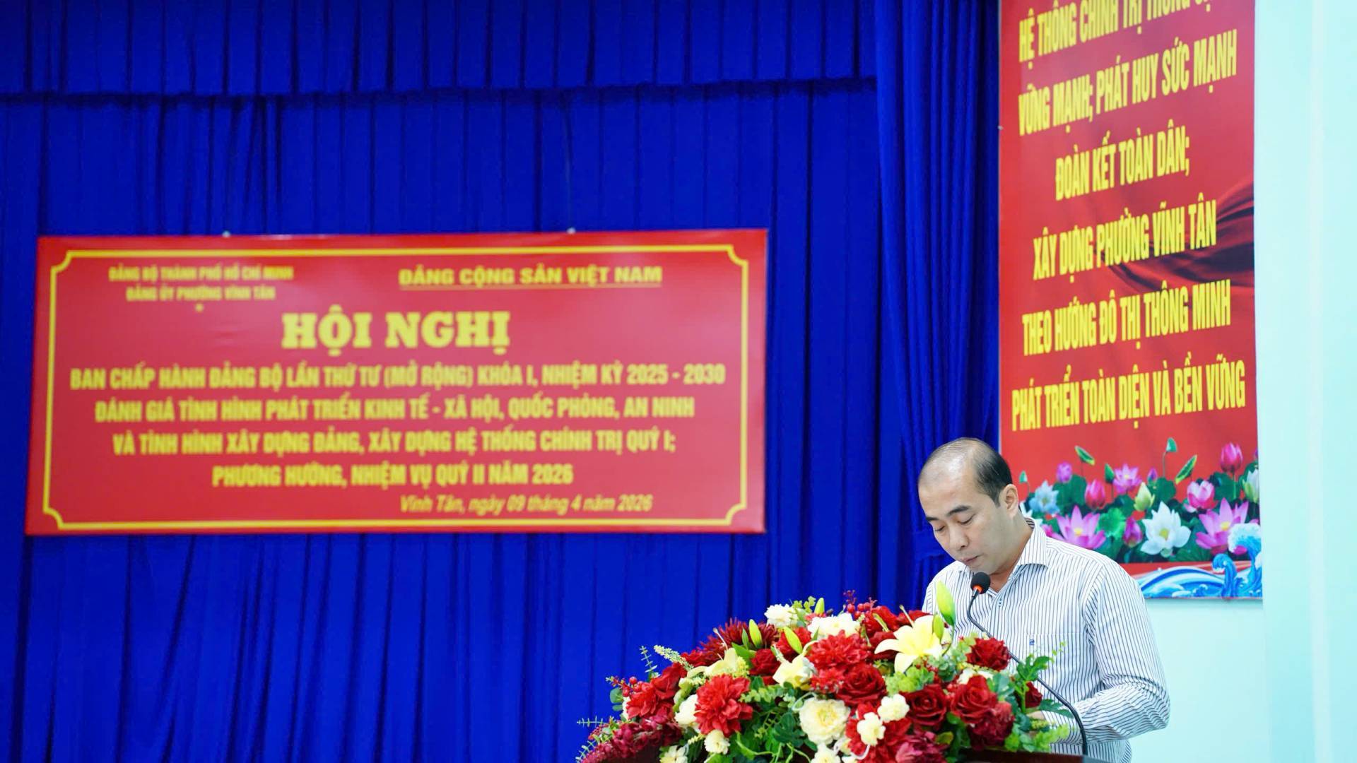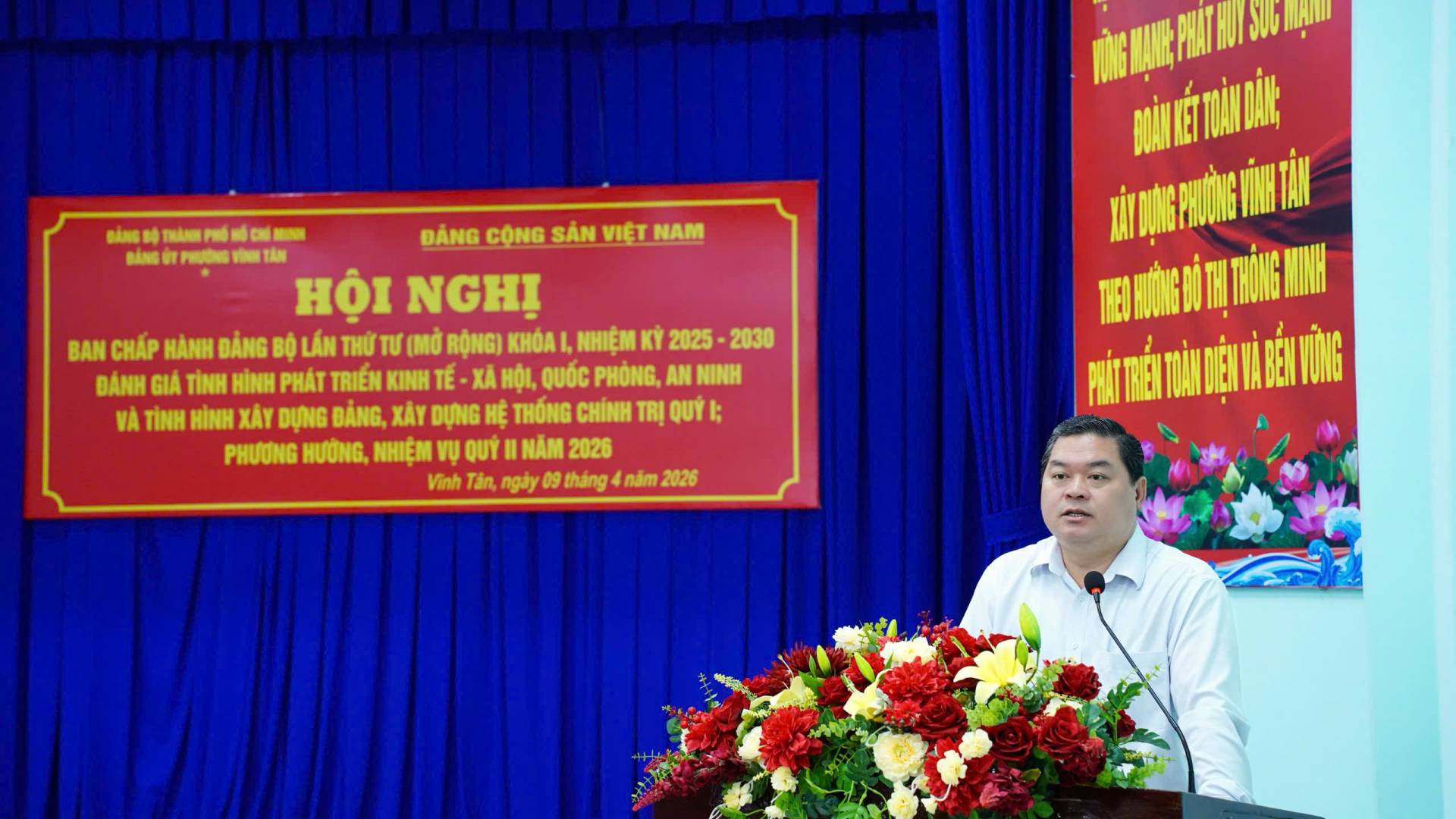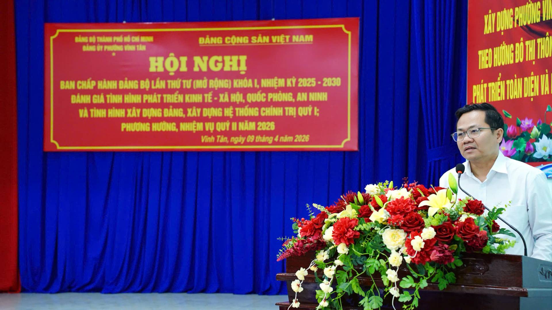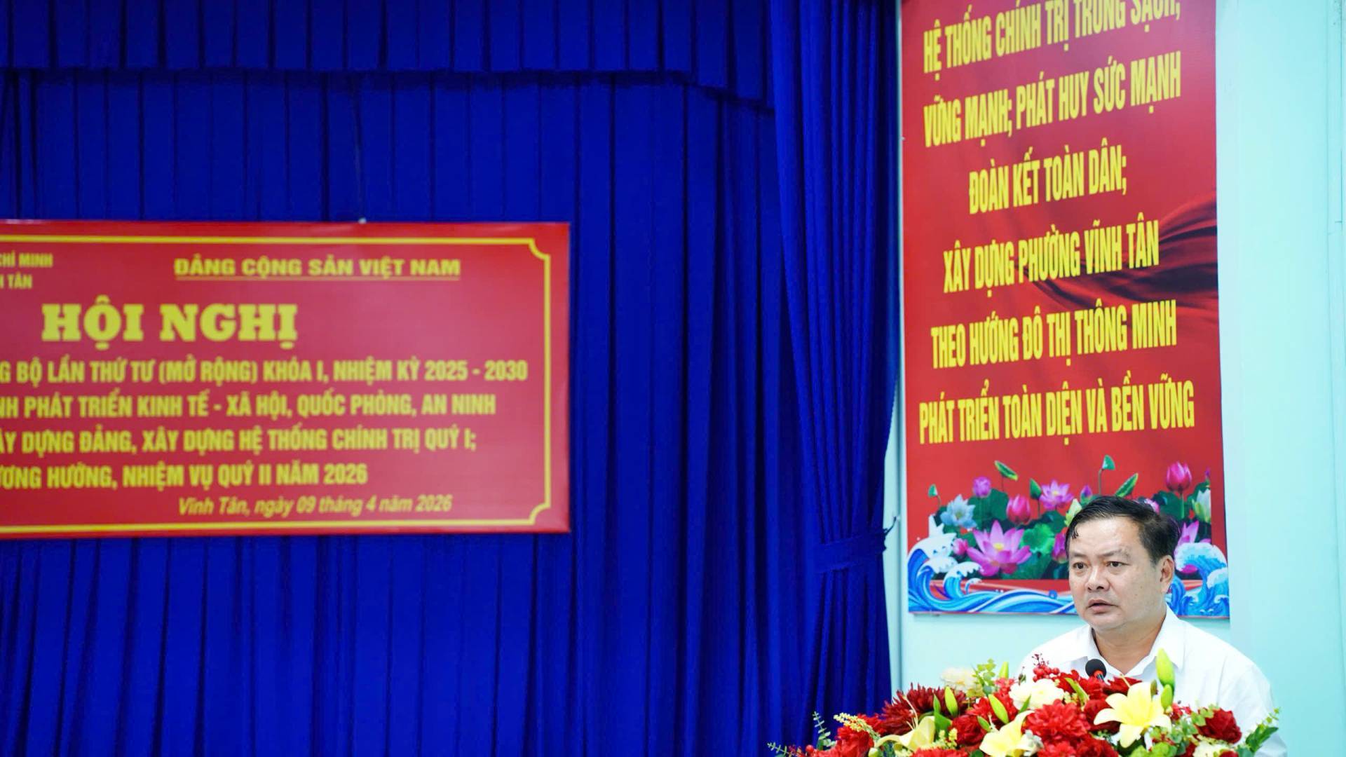 Ngày 09/4/2026, Đảng ủy phường Vĩnh Tân đã tổ chức Hội nghị Ban Chấp hành Đảng bộ phường lần thứ 4, khóa I, nhiệm kỳ 2025 - 2030 (mở rộng) nhằm đánh giá kết quả lãnh đạo thực hiện nhiệm vụ phát triển kinh tế - xã hội, quốc phòng, an ninh, công tác xây dựng Đảng và hệ thống chính trị quý I; đồng thời đề ra phương hướng, nhiệm vụ công tác quý II năm 2026.