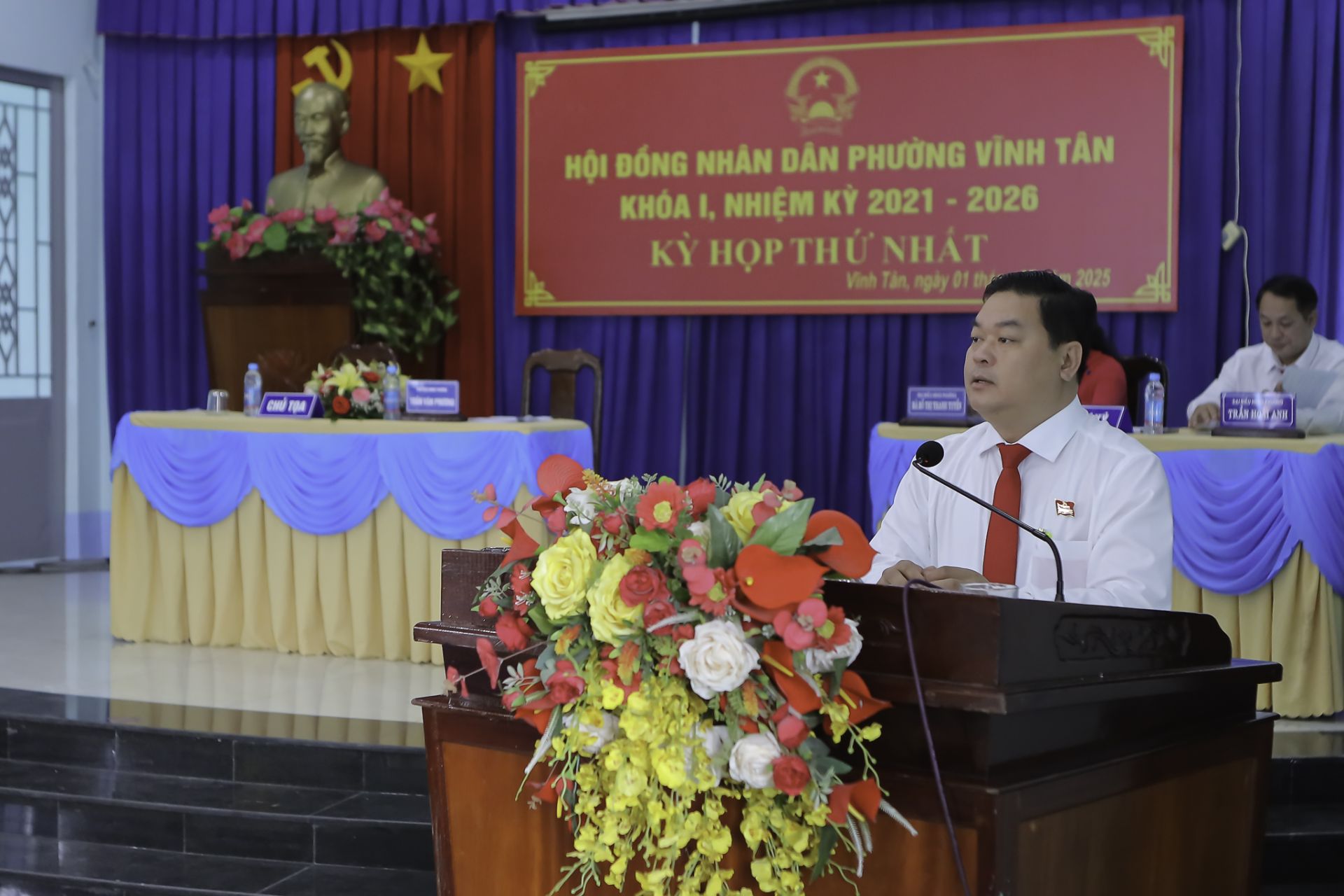 Phát biểu tại kỳ họp, Bí thư Đảng uỷ, Chủ tịch HĐND phường Vĩnh Tân khẳng định, căn cứ các quy định của Luật, bám sát các chủ trương, chỉ đạo của Trung ương, của thành phố Hồ Chí Minh và của Ban Thường vụ Đảng ủy phường Vĩnh Tân, HĐND phường Vĩnh Tân đã công bố các Nghị quyết của Thường trực HĐND thành phố Hồ Chí Minh và Thường trực HĐND phường về công tác nhân sự theo đúng trình tự, thủ tục.