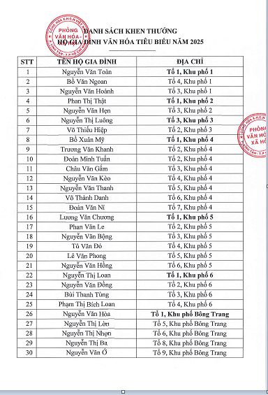Theo đề nghị của Trưởng Ban điều hành 11 khu phố về việc đề nghị khen thưởng Gia đình văn hóa tiêu biểu năm 2025;