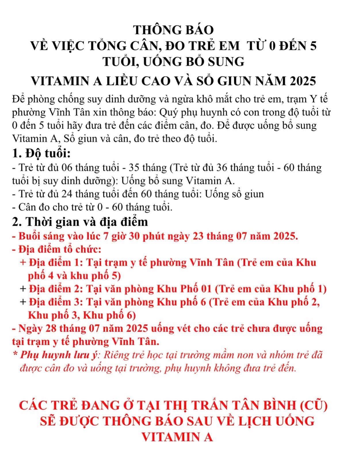 THÔNG BÁO VỀ VIỆC TỔNG CÂN, ĐO TRẺ EM TỪ 0 ĐẾN 5 TUỔI, UỐNG BỔ SUNG VITAMIN A LIỀU CAO VÀ SỔ GIUN NĂM 2025