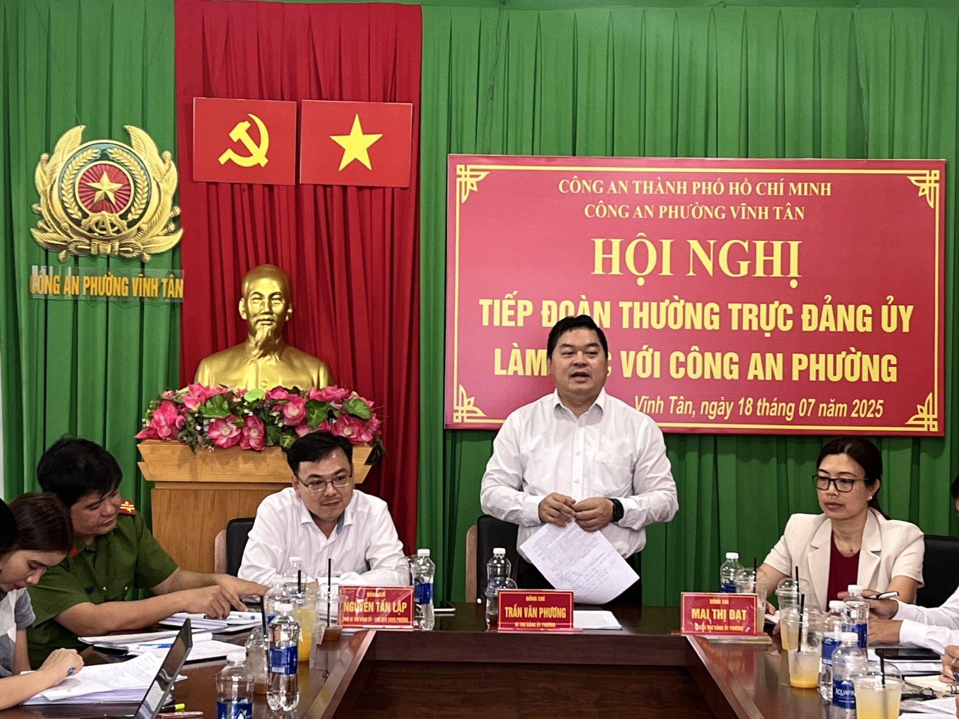 Phát biểu tại buổi làm việc, đồng chí Trần Văn Phương - Bí thư Đảng uỷ, Chủ tịch HĐND phường Vĩnh Tân ghi nhận và biểu dương tinh thần trách nhiệm, sự chủ động, linh hoạt trong thực hiện nhiệm vụ của toàn thể cán bộ, chiến sĩ Công an phường thời gian qua. Về phương hướng, nhiệm vụ trong thời gian tới, đồng chí đề nghị Công an phường tiếp tục cụ thể hoá các văn bản chỉ đạo của cấp trên để tổ chức triển khai thực hiện hiệu quả; xây dựng quy chế làm việc của Chi bộ, quy chế phối hợp với lực lượng Quân sự trong nhiệm vụ giữ gìn an ninh trật tự địa phương, đồng thời xây dựng quy chế phối hợp với Công đoàn, Chi Đoàn thanh niên để tổ chức thực hiện nhiệm vụ hiệu quả. Trong công tác bầu cử đại biểu Quốc hội khoá XIV và đại biểu HĐND các cấp nhiệm kỳ 2026 - 2031 vào đầu năm tới. Công an phường cần nêu cao tinh thần trách nhiệm, phối hợp tốt để đảm bảo an toàn tuyệt đối cho công tác bầu cử. Đồng thời, tiếp tục tăng cường công tác phòng, chống tội phạm, công tác tuyên truyền trong Nhân dân; đặc biệt tại các khu nhà trọ, công nhân, học sinh; tăng cường công tác phòng cháy, chữa cháy, góp phần giữ vững an ninh chính trị, trật tự an toàn xã hội địa phương.