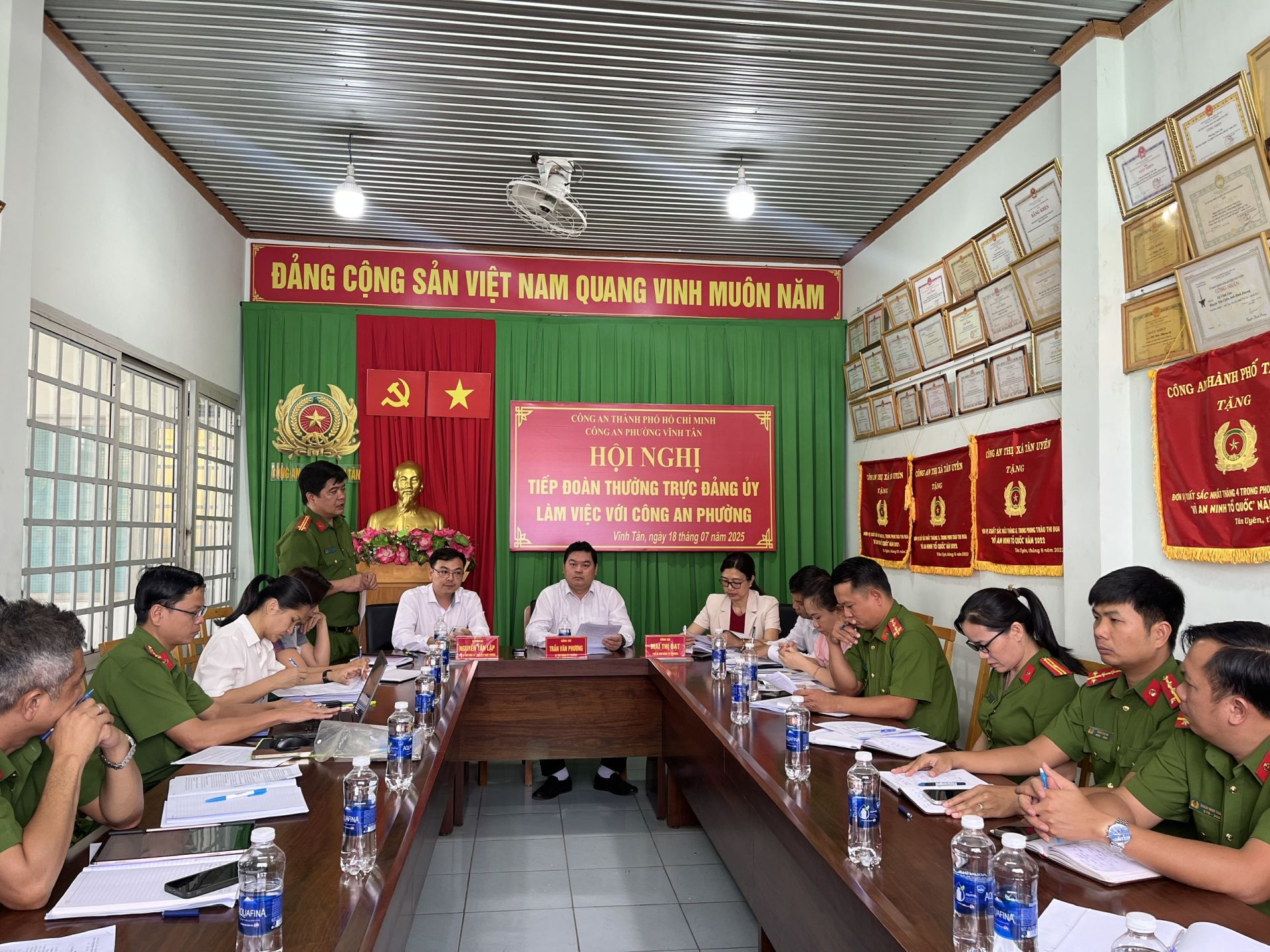 Chiều ngày 18/7/2025, tại Trụ sở Công an phường, Thường trực Đảng ủy phường Vĩnh Tân đã có buổi làm việc với lãnh đạo và cán bộ, chiến sĩ Công an phường về tình hình tổ chức, vận hành bộ máy và triển khai nhiệm vụ đảm bảo an ninh trật tự trên địa bàn sau sáp nhập hành chính.