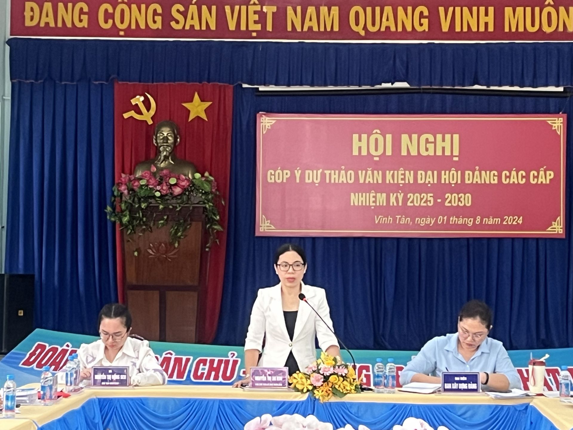Ngày 01/8/2025, Tổ tuyên truyền Đại hội đại biểu Đảng bộ phường Vĩnh Tân lần thứ I, nhiệm kỳ 2025 – 2030 họp triển khai thực hiện nhiệm vụ. Đồng chí Nguyễn Thị An Kim – Ủy viên Ban chấp hành Đảng ủy, Phó Chủ tịch UBND phường, Tổ trưởng Tổ Tuyên truyền, trang trí Đại hội chủ trì, cùng các đồng chí thành viên Tổ.