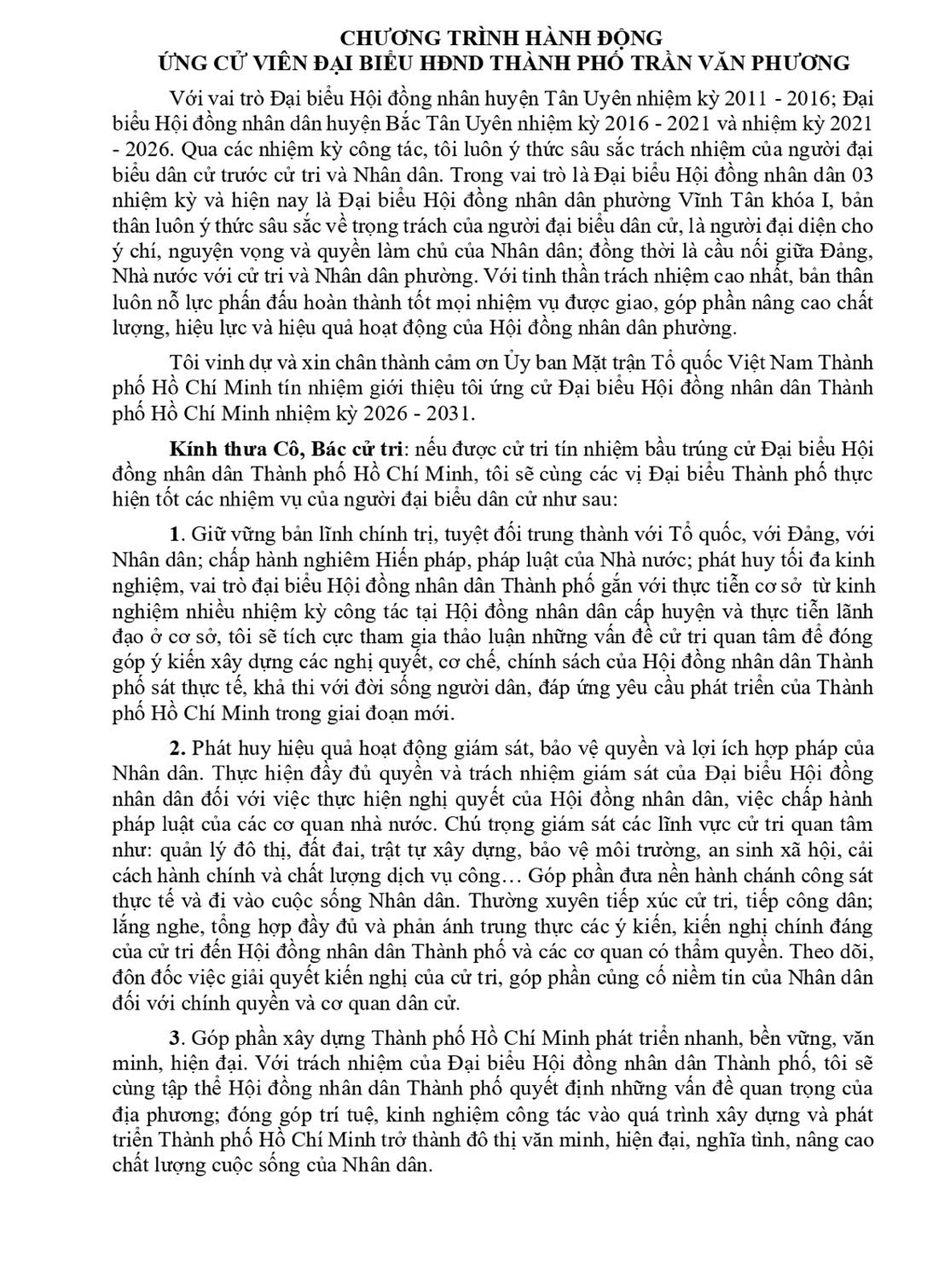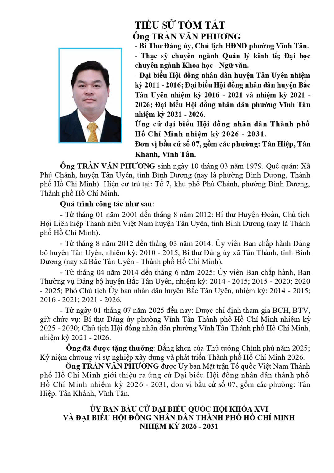 TRÂN TRỌNG GIỚI THIỆU QUÝ CỬ TRI TÓM TẮT TIỂU SỬ VÀ CHƯƠNG TRÌNH HÀNH ĐỘNG ÔNG TRẦN VĂN PHƯƠNG ỨNG CỬ ĐẠI BIỂU HỘI ĐỒNG NHÂN DÂN TP. HỒ CHÍ MINH KHÓA XI NHIỆM KỲ 2026 - 2031